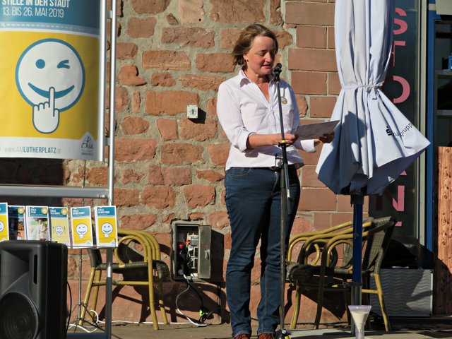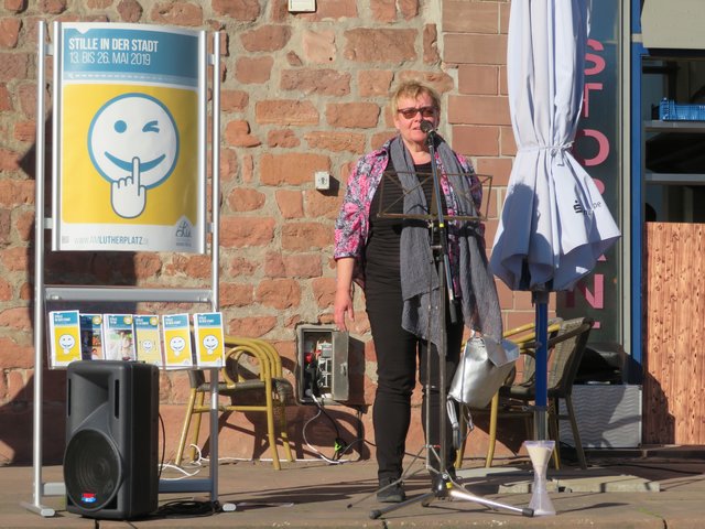 Die Dekanin Barbara Kohlstruck meinte in ihrer Ansprache, der Wunsch nach Stille sei nicht an diese Jahreszeit gebunden. Wir leiden unter Lärm von Rasenmähern, Autos etc. aber auch zu Hause haben wir meistens keine Stille, denn Handys, Radio und TV stören diese oft. Stille könne aber auch bedrohlich und unheimlich sein, vor allem nachts. Es gebe eine Stille vor der Angst und Anspannung. Die Stille vor dem Sturm ist sprichwörtlich. Schon früh im Kindesalter hörten wir von unseren Eltern Floskeln wie „Sei still!“ Man solle nur reden, wenn man gefragt würde. Stille hieße Entspannung, Abschalten und Erholen. Stille müssen wir suchen und einen Platz in unserem Leben einräumen. Vielleicht sollten wir einen Vorrat an Stille anlege, denn Stille heißt auch Kraft schöpfen und uns nicht so schnell in Hektik verlieren, einen Vorrat anlegen, von dem wir lange und genussvoll zehren können.