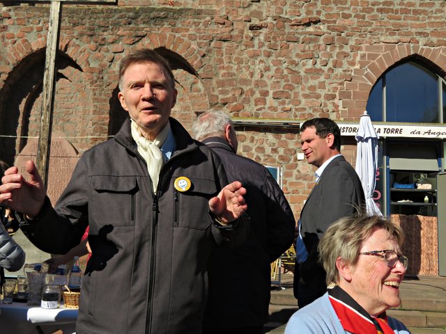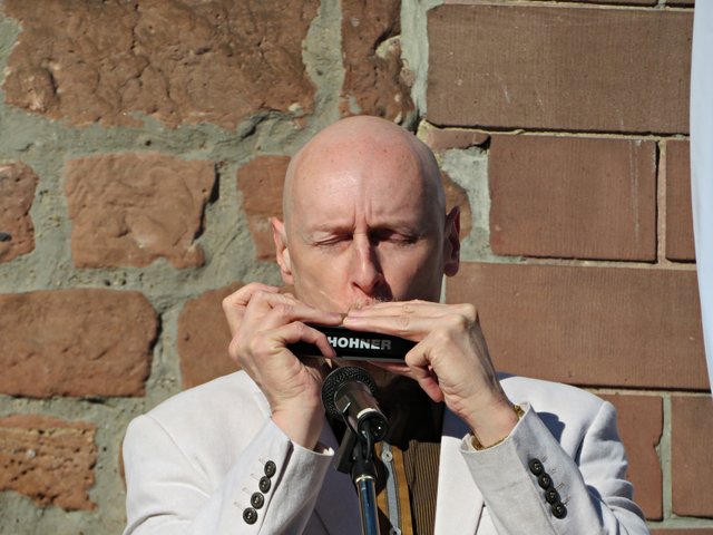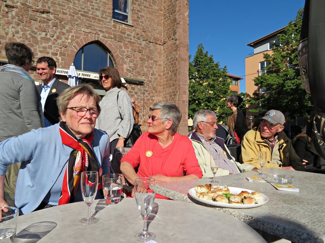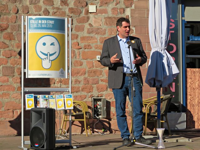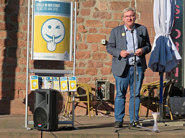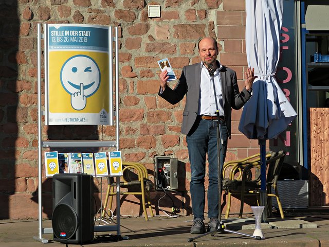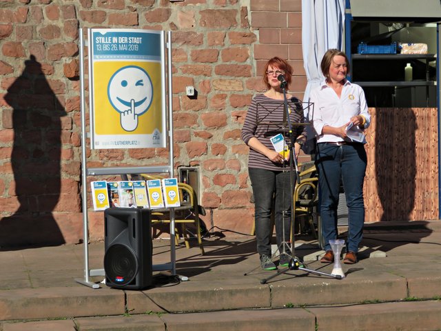 Die beiden Verantwortlichen und durch das Programm Führenden waren Bärbel Bähr-Kruljac und Susanne Schramm von der Evangelischen Kirche der Pfalz, die beide bei der Citykirche/Bildung und „Kultur am Lutherturm“ arbeiten. Über 15 weitere Projektunterstützer aus städtischen Einrichtungen und Vereinen stellten ihre Angebote vor. Der Platz vor dem Ristorante La Torre da Angelo im Lutherturm war sehr gut besucht. Die Gäste wurden vorzüglich von dort bewirtet mit Sekt/Wasser, Pizzen und allerlei kleinen Köstlichkeiten. Jens Bunge war mit seiner Mundharmonika zur musikalischen Untermalung eingeladen worden. Begrüßt wurden unter anderem Angelika Ritthaler, Vorsitzende des Lutherturm e.V., der als Förderverein die Arbeit „Am Lutherturm“ unterstützt, Pfarrer Frank Wolf, der alle evangelischen Kindergärten des Dekanates Ludwigshafen unter sich hat, Frau OB Jutta Steinruck und Dekanin Barbara Kohlstruck. Um 18.00 Uhr läuteten die Kirchenglocken. Und es war ganz einfach nur schön – einfach dem Läuten zuzuhören und den Halbmond neben dem Turmfirst zu sehen. Frau Schramm erklärte die Stille mit folgenden Worten: Stille beruhigt das Lebenstempo, Stille kann verzaubern, Stille der Inseln gibt es zu entdecken, man solle Stille in sich selbst finden. Sie bedankte sich bei Frau Steinruck, den Teilnehmern des Fotowettbewerbes, dem Musiker und allen, die Interesse an diesem Projekt haben.