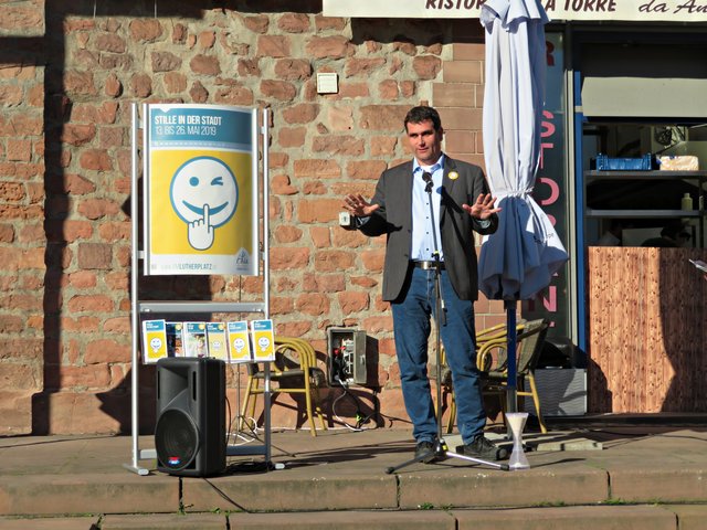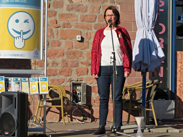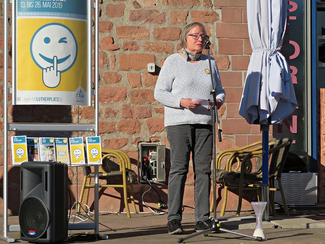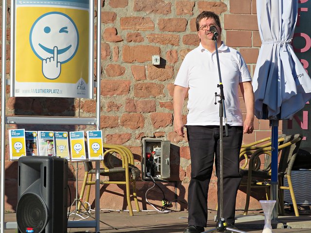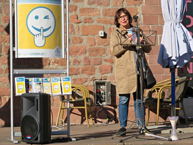 Die beiden Organisatorinnen stellten eine große Sanduhr auf mit dem Hinweis, dass Zeit fließt und die Leute, die hier ihre Angebote vorstellen sollten, alle gleich viel Zeit, nämlich zwei Minuten, haben sollten. Alle Redner und Rednerinnen fassten sich aber kurz und eine Menge Sand verblieb im oberen Teil. Die einzelnen Termine und Angebote bis zum 26. Mai können Sie unter http://www.amlutherplatz.de/ finden. (mel)