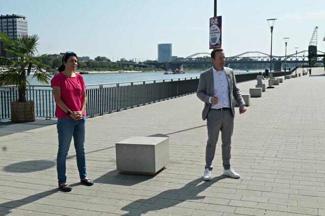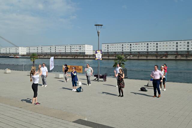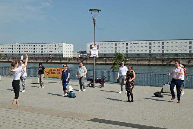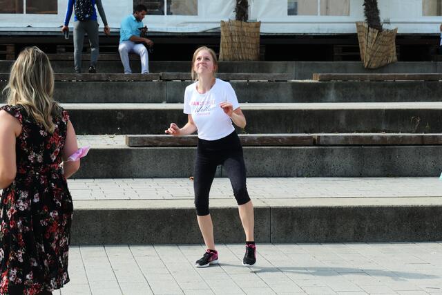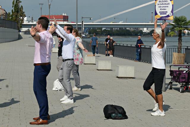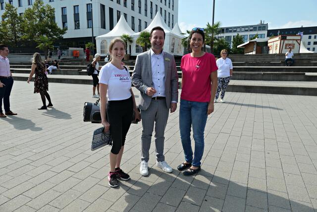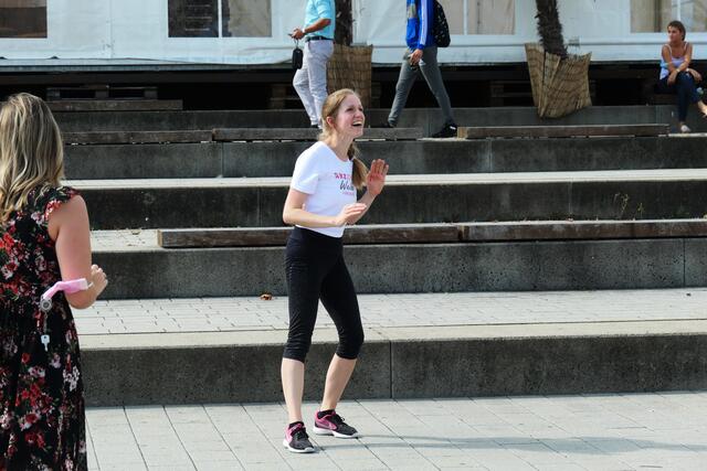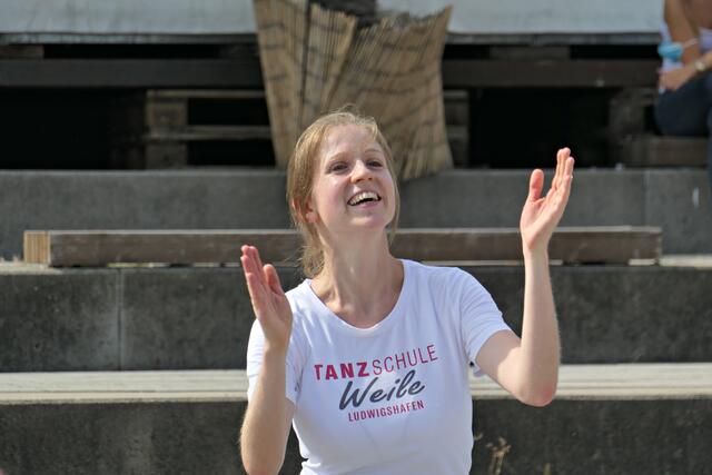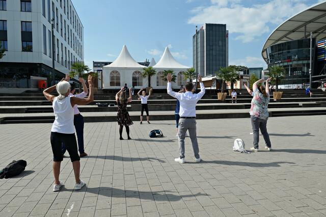 Als einzige Männer nahmen ganz tapfer – es waren an die 30 Grad Celsius – im Cityhemd gekleidet der Rheingalerie-Manager Patrick Steidl und Jan Freer (Optiker) teil, dieser hatte auch eine Angestellte dazu bewegen können mitzumachen. Neben Eva Weile von der gleichnamigen Tanzschule in Ludwigshafen, die für die Leibesertüchtigung zuständig war, gesellte sich Nadine Bollinger als Vertreterin von der BKK Pfalz und die Bewegungsmanagerin des Landessportbundes Saskia Helfenfinger-Jeck hinzu. Die Sportabzeichenbeauftragte Ulla Walther-Thiedig war zwar auch anwesend, hielt sich an diesem Mittag jedoch mit Sport zurück; sie darf sich dann nächsten Donnerstag ein paar Übungen für die Teilnehmer überlegen. Eva Weile wird in zwei Wochen wieder in ihrer lockeren charmanten Art die Gruppe übernehmen. Diese Aktion „Bewegte Mittagspause“ findet nun jeden Donnerstag bis 28. Oktober hier statt. Vielleicht konnte man ja den ein oder anderen Zuschauer dafür begeistern. Wer weiß? Es wird immer ein anderer Übungsleiter oder eine Übungsleiterin die Regie haben – Frau Helfenfinger-Jeck hatte im Vorfeld ihre Fühler ausgestreckt und ist fündig geworden.