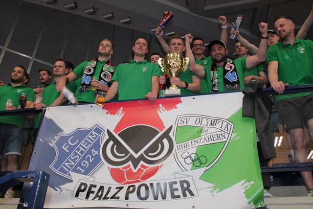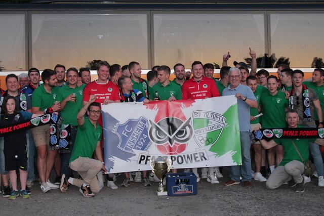 Die Fußballer vom SV Olympia Rheinzabern hatten ihren Siegerpokal dabei, denn die Spieler gewannn Mitte Mai das Pokalendspiel gegen den FV Neuburg mit 7:6 nach Elfmeterschießen. Leider hat der Pokal den Besuch bei den Eulen Ludwigshafen nicht ganz unbeschadet überstanden.