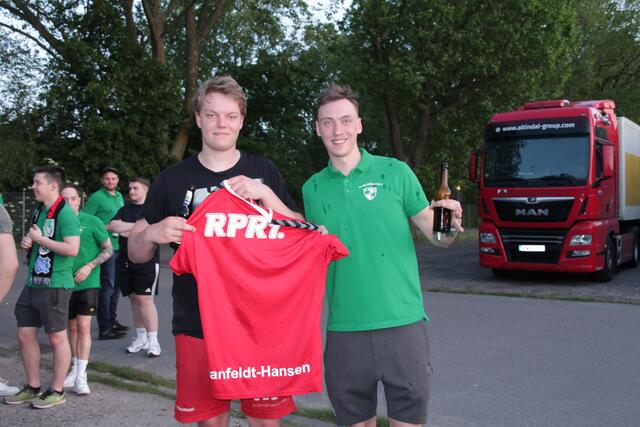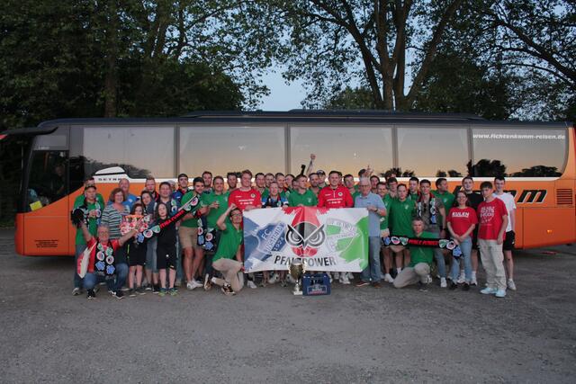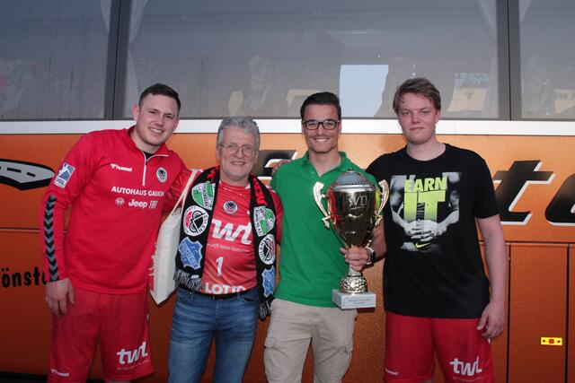 Nach dem Spiel spendierte das Eulen-Team den Fußballern als Dank für die lautstarke Unterstützung noch einen Kasten Bier und die Eulen-Spieler Marc-Robin Eisel sowie Kasper Manfeldt Hansen gingen für ein Erinnerungsfoto noch mit auf den Parkplatz zum Fanbus.