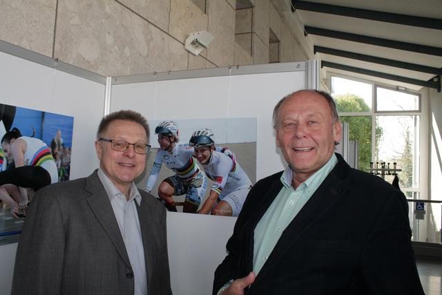 Foto 2: Sportfotograf Bernhard Kunz (rechts) mit dem ehemaligen Bürgermeister Otto Reiland bei der Sportfoto-Ausstellung in Waldsee