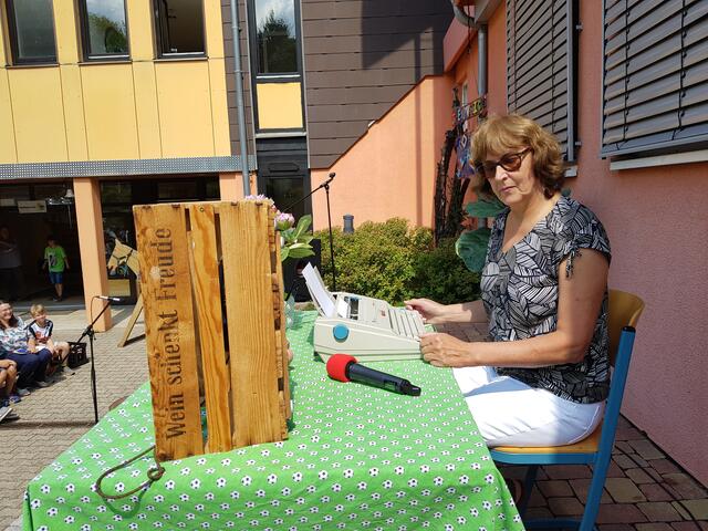 Als Livegast bei der Schul-AG "Voice of Waldhaus" und beim Waldhaus-Quiz gab die Geschäftsleiterin ebenfalls ihr Bestes, so dass sie sich zum Abschluss unter Jubel im Ruhestand auf einen Liegestuhl im kühlen Schatten niederlassen durfte.