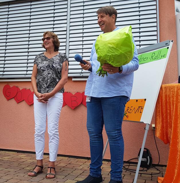 Zu guter Letzt erschien noch ein besonderer Überraschungsgast. Bürgermeister Markus Bechler hatte es sich nicht nehmen lassen, der Jubilarin persönlich seine besten Wünsche zum Ruhestand, Blumen und eine Ehrenurkunde zu überreichen.