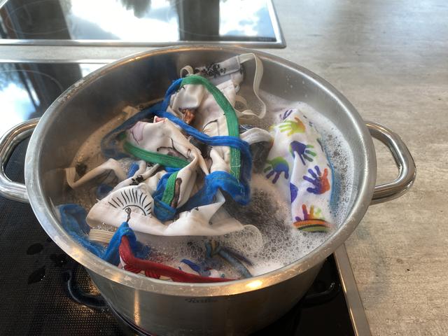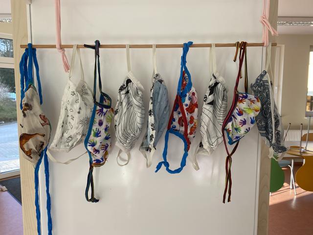 Die Tagesgruppenkinder besitzen sogar ein Doppelset, denn sie erscheinen täglich bei Frau Grass in der Schulküche, die ihre Masken dann auskocht und trocknet.