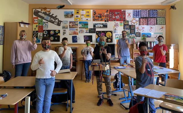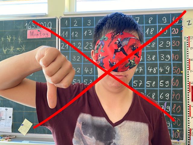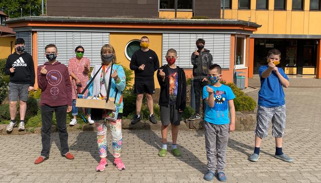 Da die Kinder und Jugendlichen nun vermehrt Masken tragen sollen, ist es auch wichtig, dass sie den Umgang damit lernen. Deshalb besuchte Frau Grass nun mit ihrem „Masken-Bauchladen“ alle "Gruppenklassen" und briefte die Jungs zum Thema Behelfsmasken.