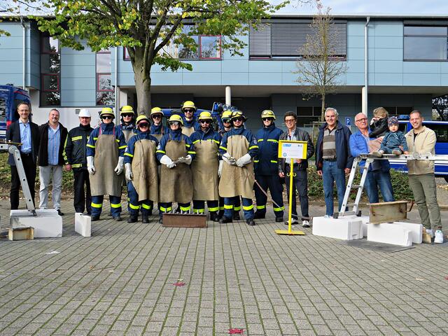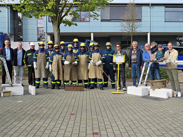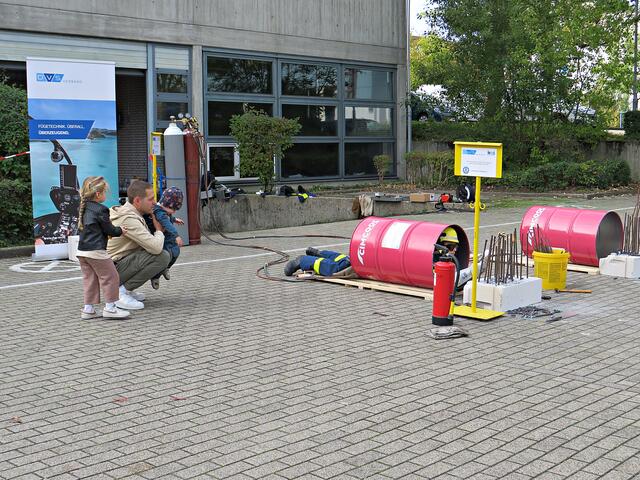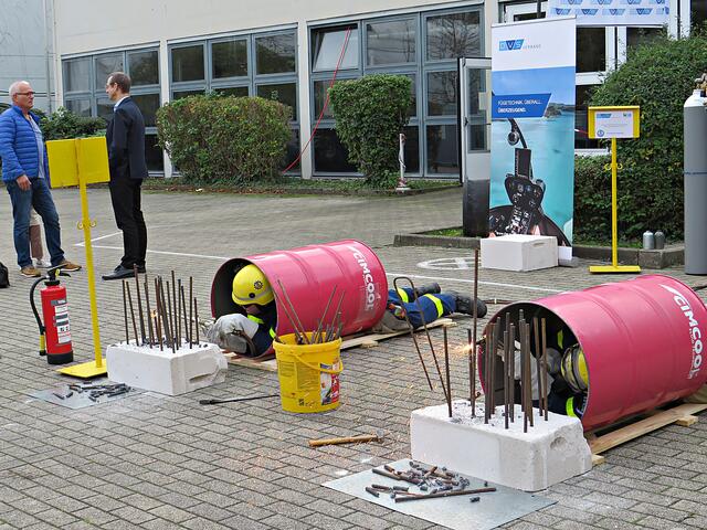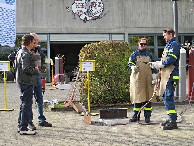 Zuschauer waren ebenfalls für dieses spannende Schauspiel mit Sicherheitsabstand vor Ort, denn das sieht man nicht alle Tage. Der ehemalige Schulleiter, Herr Becker, und der jetzige Schulleiter, Herr Herrmannspahn sowie der ehemalige Schweißlehrer, Herr Gottmann (Leiter des Fördervereins der Schule), Herrn Reichert als stellvertretender Rektor der Schule und Schüler Samuel Schmidt, der beim Aufbau geholfen hatte, waren alle fasziniert vom stiebenden Funkenflug. Auch der 2-jährige Elias und Papa André Fehringer waren neugierig. Normalerweise in der Kfz-Abteilung der Schule tätig verfolgte Udo Vetter mit Enkelin Amelie das Spektakel. Und in der Luft hing ein gewisser „Schweißgeruch“, der vom glühenden Eisen herkam. Nächstes Jahr gibt es hier beim DVS etwas zu feiern: 50 Jahre Schweißkurse. Für die heutige Unterstützung mit verschiedenem Material bedankt man sich herzlich bei der Metallbaufirma Herrmann in Mauer.