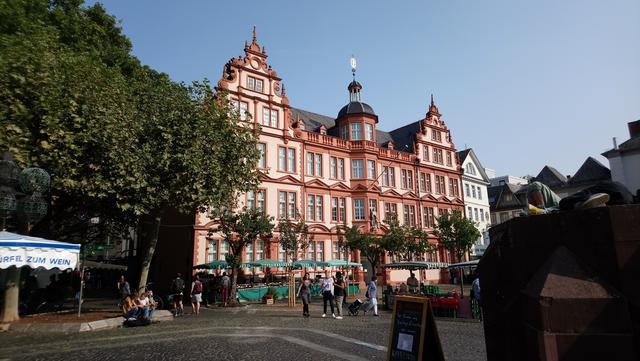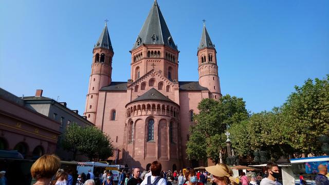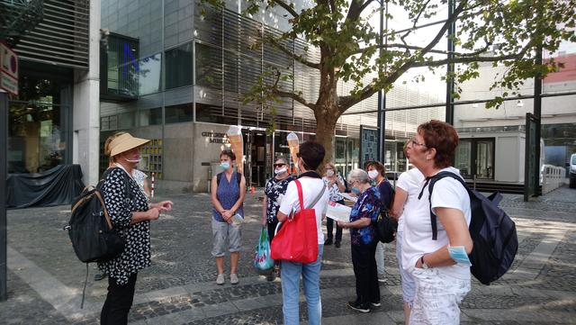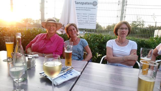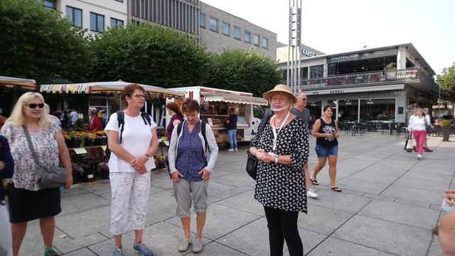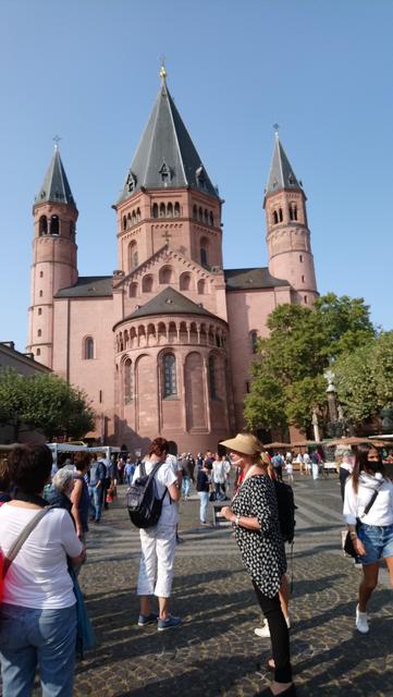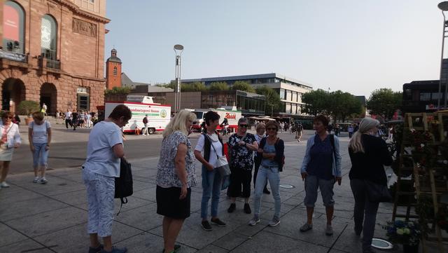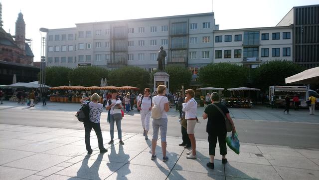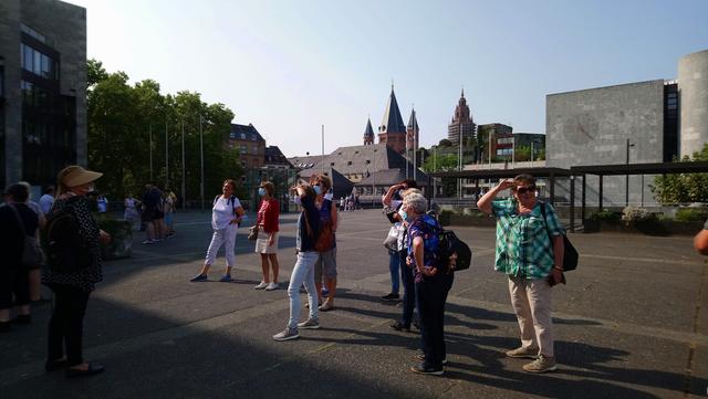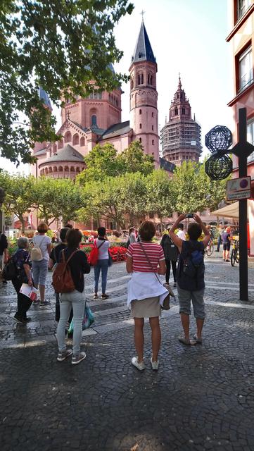 Bei prächtigem Spätsommerwetter ging es mit der S-Bahn nach Ludwigshafen Hauptbahnhof. Die Umsteigezeit zur Weiterfahrt mit der Regionalbahn in die rheinland-pfälzische Landeshauptstadt wurde für das beliebte Sektfrühstück mit Piccolo und Brezel genutzt. Nach der Weiterfahrt und Ankunft in der Gutenbergstadt ging es zum Treffpunkt mit der Stadtführerin am Denkmal des berühmten Sohnes von Mainz. Bei einem Stadtspaziergang erzählte Monika Hänfler-Lohn Wissenswertes über die Stadt am Rhein. Warum manche Straßenschilder rot sind, diese zeigen an, dass sie zum Rhein führen -. Die Blauen zeigen, dass diesese laufen parallel zum Rhein verlaufen. Der berühmte und beliebte Mainzer Wochenmarkt üblicherweise nur rund rund um den Dom, wurde situationsbedingt weiter in die Straßen und Plätze ausgebreitet, damit Abstand möglich ist. Das Marktfrühstück mit den drei WWWs - Worscht, Weck und Woi - kann jetzt nicht mehr auf Bierbänken genossen werden, Worscht, Weck und Woi gibt es aber trotzdem an den Marktständen zu kaufen. Weiter ging es zum Rheinufer und an hübschen Plätzen mit herrlichen Fachwerkhäusern mit eigenen Namen oder blühenden Rabatten. So erfuhren die Montagsfrauen auch, dass Johannes Gutenberg der Erfinder des modernen Buchdruckes eigentlich Johannes Gensfleisch zur Laden zum Gutenberg hieß und im Gutenbergmuseum Originalbibeln zu besichtige sind. Nach dem offiziellen Stadtrundgang war Zeit für ein kleines Päuschen bevor der Dom von innen besucht wurde. Den wunderschönen und farbenfrohen Kirchenfenster von Marc Chagall in der Kirche St. Stephan, der berühmte Fastnachtsbrunnen, der Holzturm, in dem der Schinderhannes einsaß, all das wurde in kleineren Gruppen besichtigt. Dazwischen noch einen Kaffee, Eis oder einen Cocktail bevor auch die Shoppingfans auf ihre Kosten kamen. Um 17.17 Uhr ging es dann zurück nach Friedrichsfeld wo man bei einem gemeinsamen Abendessen bei Anastasia in der Vereinsgaststätte des FC Germanias der Tag ausklingen ließ. Einig waren sich alle, es war ein gelungener Ausflug und der Dank galt den Organisatorinnen Doris und Kristin.
