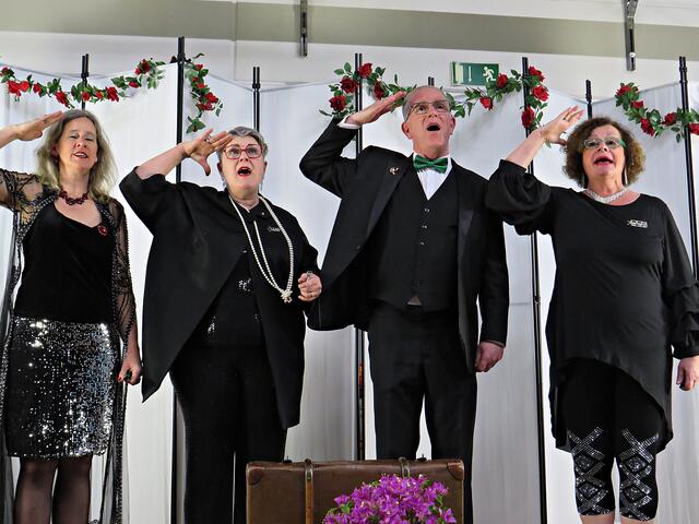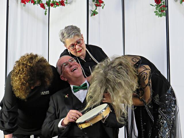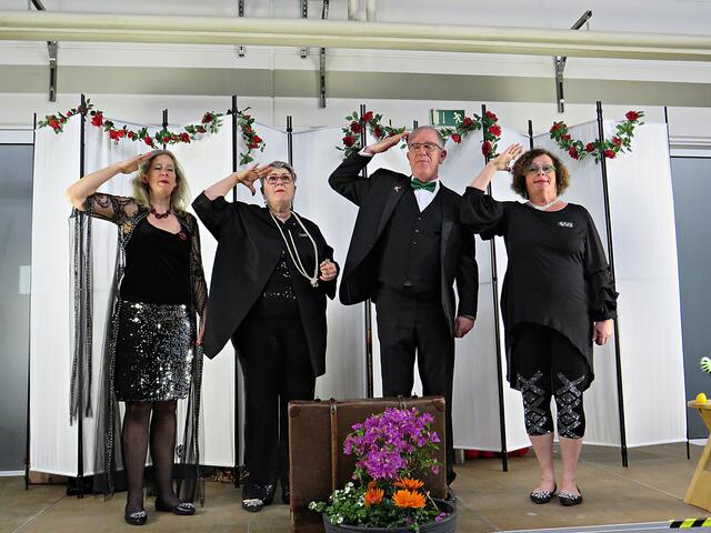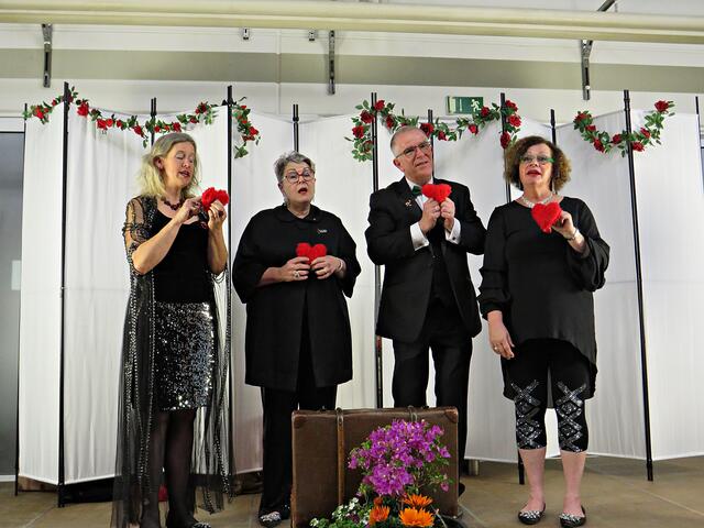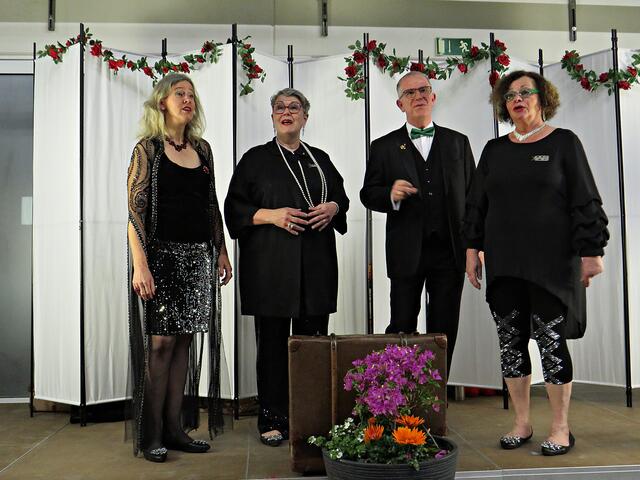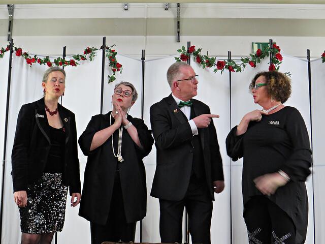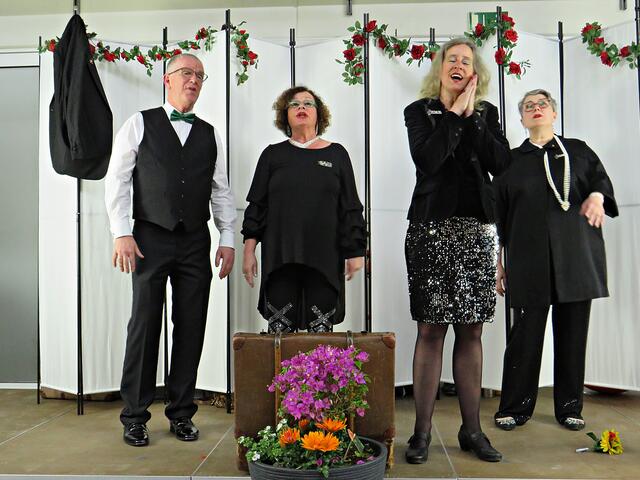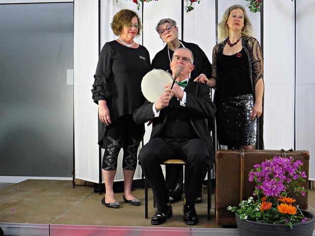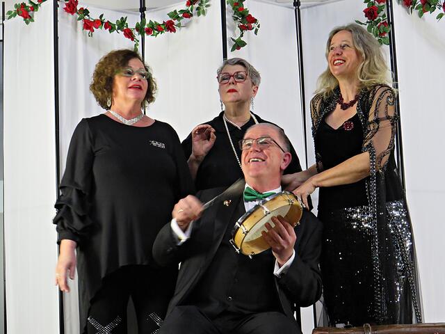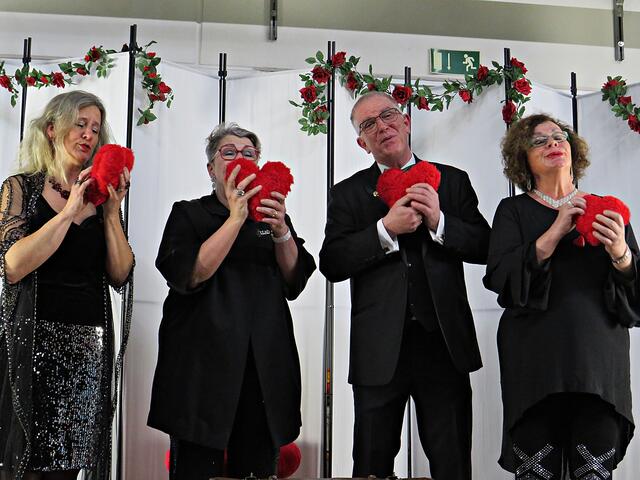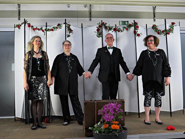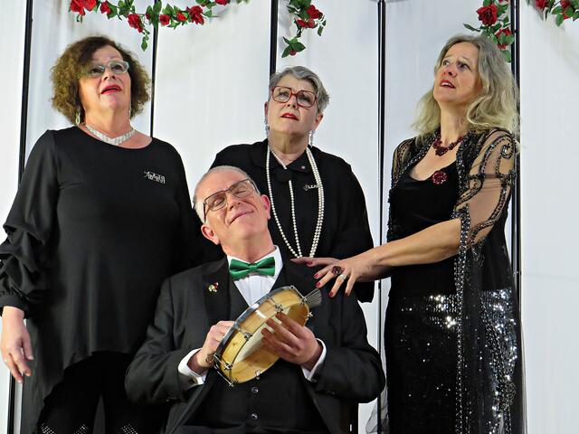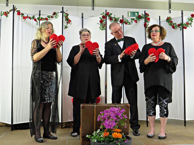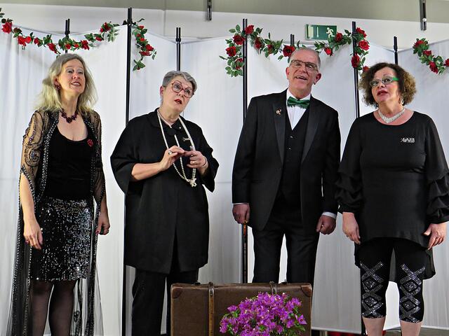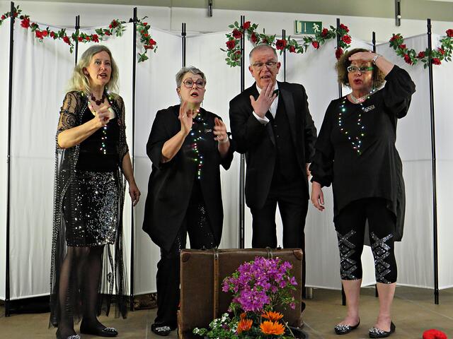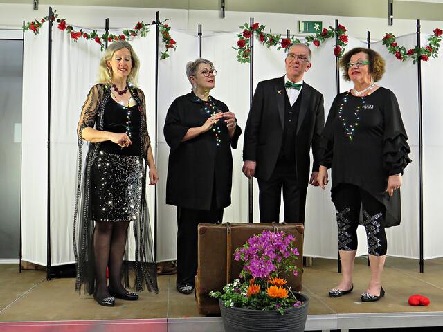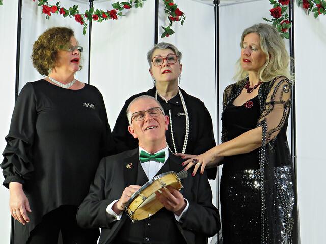Umgezogen ging es weiter mit „You“ve got a friend in me“ von Randy Newman. Sie erzählten von einem Frankreich-Besuch vor einem Jahr, bei dem die Akustik der Schlösser und Kirchen getestet wurde und sich spannende Flashmobs bildeten. „It is well with my soul“ folgte darauf. Vor fast 100 Jahren sangen die Comedian Harmonists „In der Bar zum Krokodil“ und dafür hatten sich Rainer und Helena ägyptischen Kopfschmuck übergezogen. Und was damals von 15 Sängern und 10 Fingern performt wurde, schaffte heute das Quartett ganz alleine. Bei dem Lied „Lass mich nur einmal“ von Jantje Smit war Rainer umringt von seinen drei Damen, was ihm sichtlich gefiel „Ja, es war eine großartige Zeit damals!“ Und dann besangen sie die Namen der Friseure, wie sie sich heute alle nannten und bei denen sich die Haare sträubten. Sie haben sich für die Deutschen Meisterschaften im Barbershop in 4 Wochen in Dortmund qualifiziert. Und was aus einer Schnapsidee in der Coronazeit geboren wurde, wird dort mit dem anschließend vorgetragenen Lied enden. Plüschherzen wurden geknuddelt und ins Publikum geworfen. „Flowershops“ und ein Feuerwehrlied folgten bevor es auf Weihnachten zuging. Ja, Weihnachten sei ja immer so plötzlich vor der Tür, aber nach Weihnachten sei vor Weihnachten, wir bereiten uns vor. Das Publikum durfte an der Stelle „Wasser marsch“ beherzt mitsingen bei „Merry Christmas“. Das Quartett verneigte sich und wurde einzeln vorgestellt, das heißt Schluss, Ende, Aus. Nein, nicht ohne Zugabe mit „Red nose“ und „What a wonderful world“ von Louis Armstrong. Es war ein Abend, der in sehr guter Erinnerung bleiben wird!