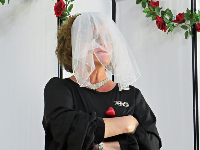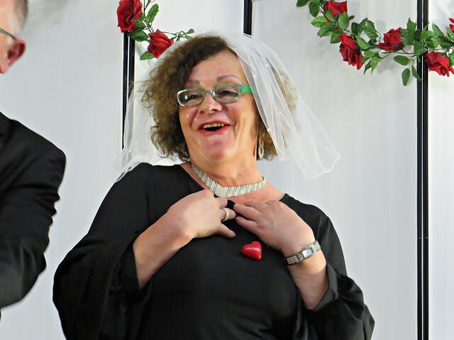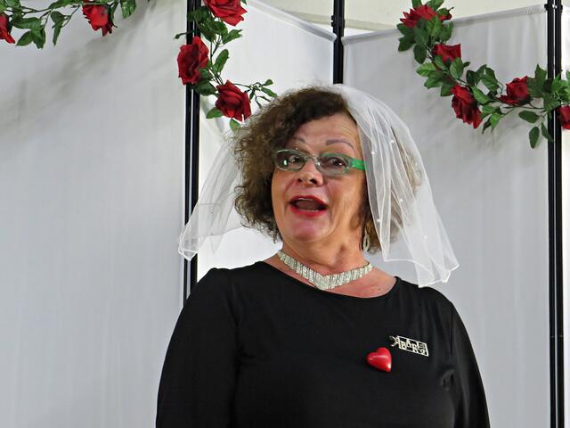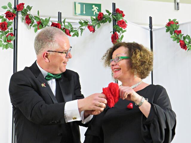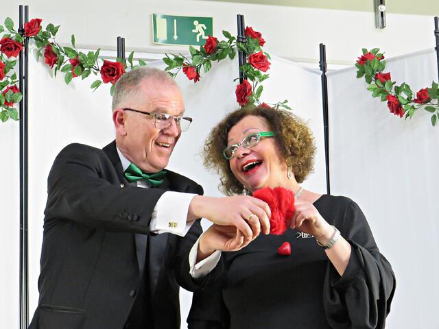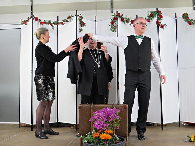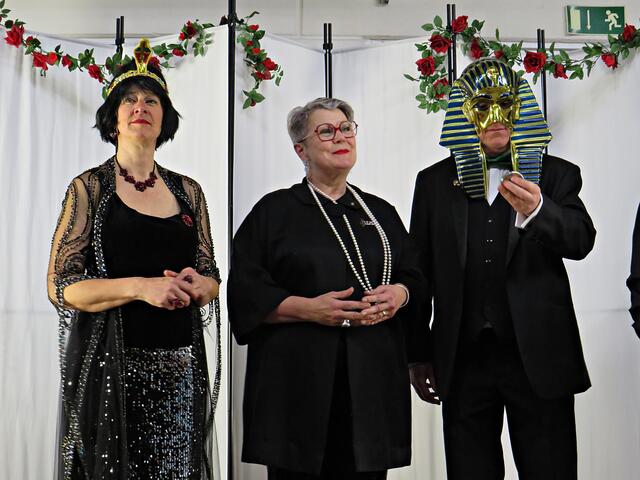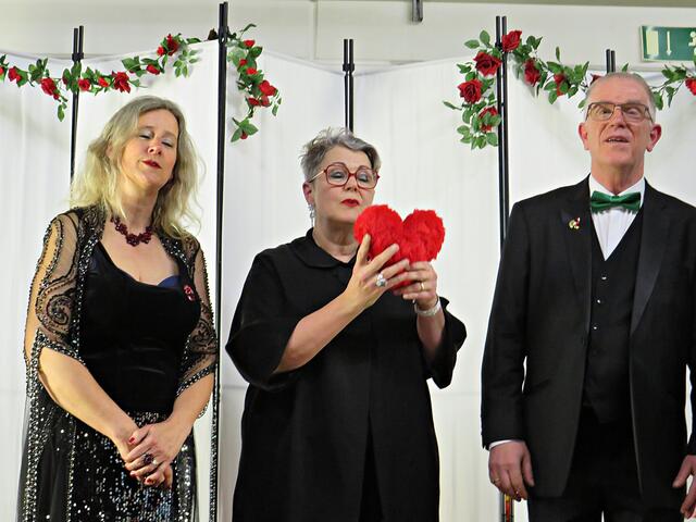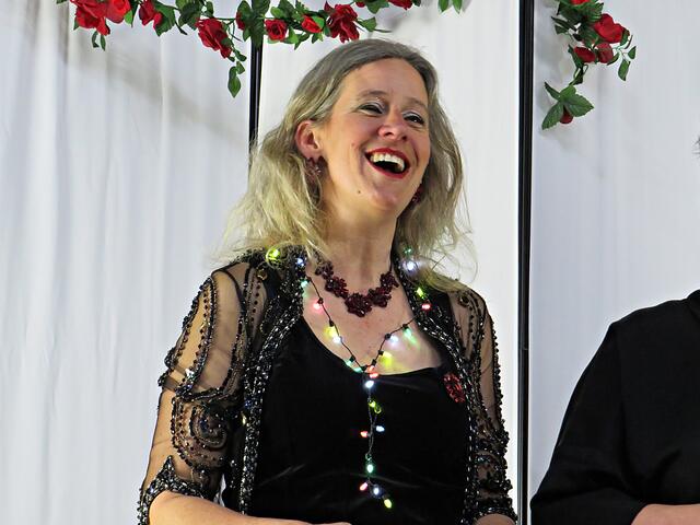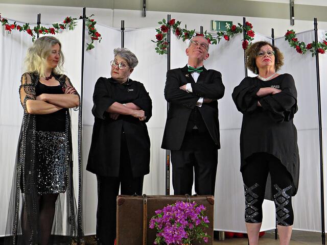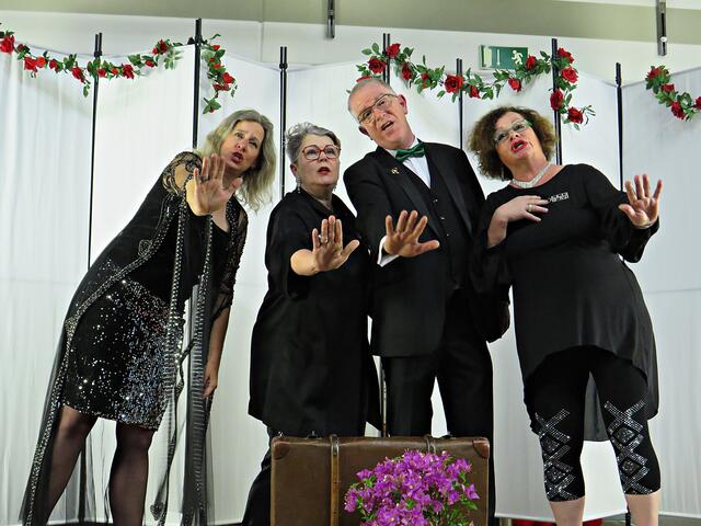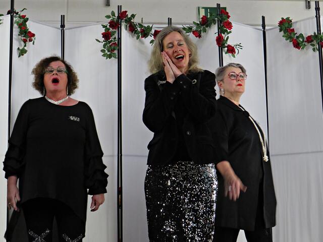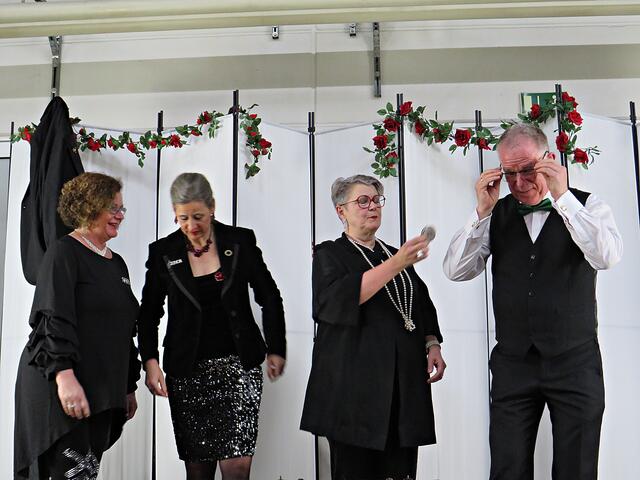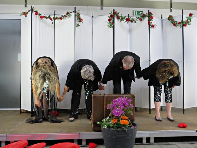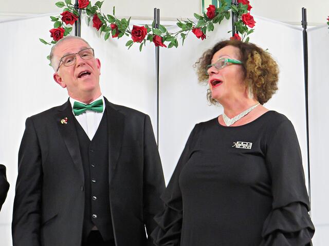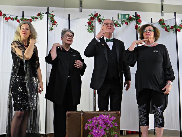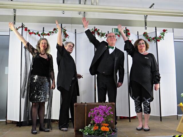 Umgezogen ging es weiter mit „You“ve got a friend in me“ von Randy Newman. Sie erzählten von einem Frankreich-Besuch vor einem Jahr, bei dem die Akustik der Schlösser und Kirchen getestet wurde und sich spannende Flashmobs bildeten. „It is well with my soul“ folgte darauf. Vor fast 100 Jahren sangen die Comedian Harmonists „In der Bar zum Krokodil“ und dafür hatten sich Rainer und Helena ägyptischen Kopfschmuck übergezogen. Und was damals von 15 Sängern und 10 Fingern performt wurde, schaffte heute das Quartett ganz alleine. Bei dem Lied „Lass mich nur einmal“ von Jantje Smit war Rainer umringt von seinen drei Damen, was ihm sichtlich gefiel „Ja, es war eine großartige Zeit damals!“ Und dann besangen sie die Namen der Friseure, wie sie sich heute alle nannten und bei denen sich die Haare sträubten. Sie haben sich für die Deutschen Meisterschaften im Barbershop in 4 Wochen in Dortmund qualifiziert. Und was aus einer Schnapsidee in der Coronazeit geboren wurde, wird dort mit dem anschließend vorgetragenen Lied enden. Plüschherzen wurden geknuddelt und ins Publikum geworfen. „Flowershops“ und ein Feuerwehrlied folgten bevor es auf Weihnachten zuging. Ja, Weihnachten sei ja immer so plötzlich vor der Tür, aber nach Weihnachten sei vor Weihnachten, wir bereiten uns vor. Das Publikum durfte an der Stelle „Wasser marsch“ beherzt mitsingen bei „Merry Christmas“. Das Quartett verneigte sich und wurde einzeln vorgestellt, das heißt Schluss, Ende, Aus. Nein, nicht ohne Zugabe mit „Red nose“ und „What a wonderful world“ von Louis Armstrong. Es war ein Abend, der in sehr guter Erinnerung bleiben wird!