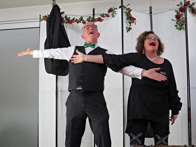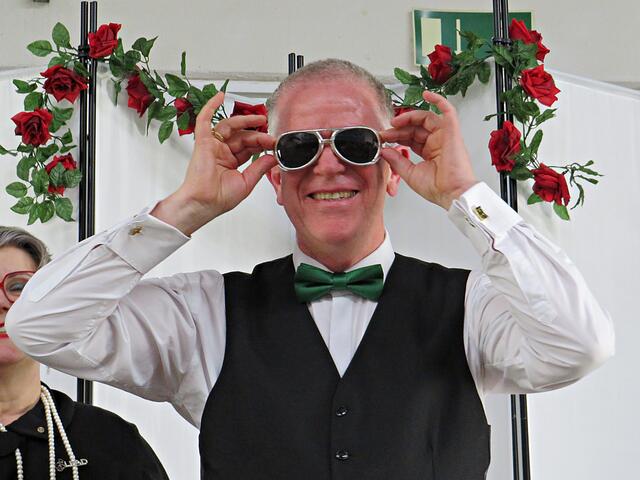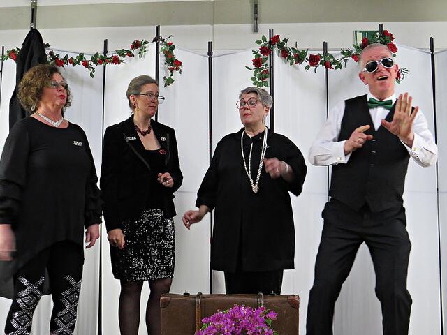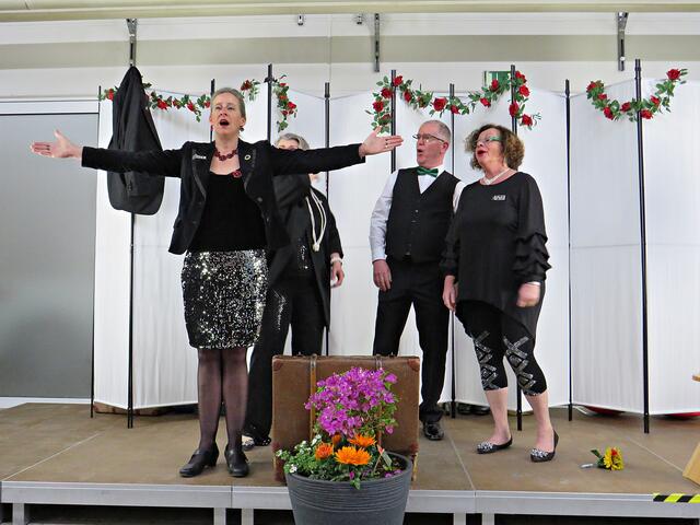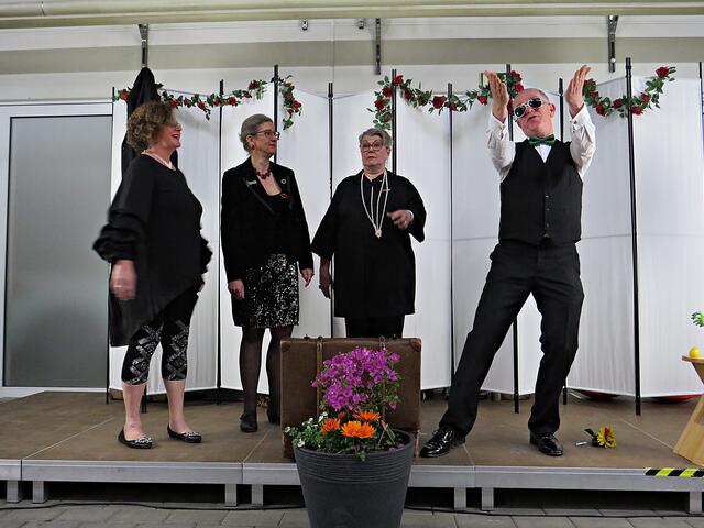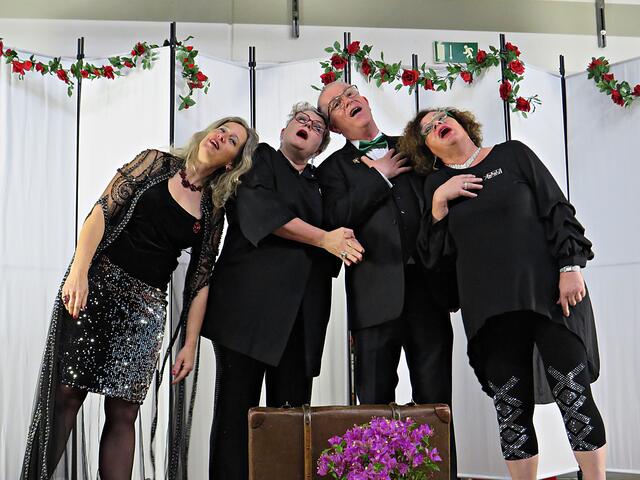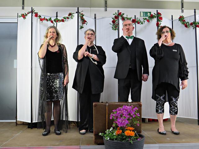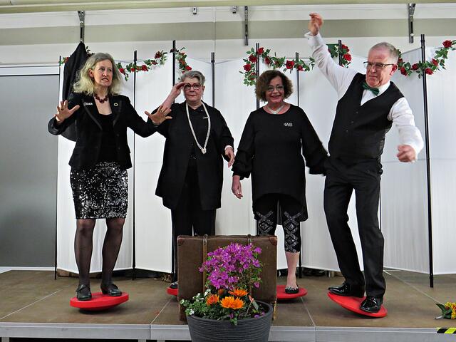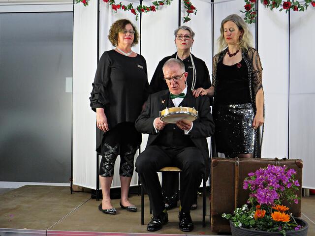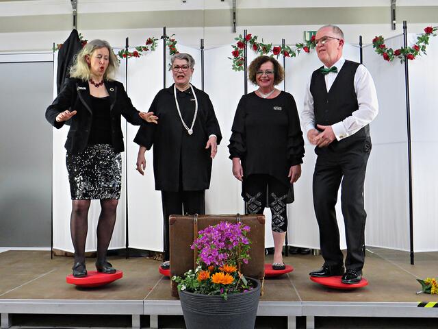 Der herrliche Einstieg mit vier tonsicheren Protagonisten erfolgte mit „Tonight“ aus der „West Side Story“. Zwischen den einzelnen Sangesdarbietungen gab es immer kleine Informationen entweder über den Song oder das Quintett an sich. So erfuhr man, dass sie seit 4 Jahren zusammen singen und aus Limburgerhof kommen. „Tja, wie alt sind wir wohl? Wir sind 229 Jahre alt und wiegen so viel wie ein altes Klavier.“, was etliche Lacher hervorrief. Der Rotary Club Limburgerhof/Vorderpfalz feiert dieses Jahr 20-jähriges Jubiläum und steht für Freundschaft. Es gäbe sehr viel zu tun und bei dieser Verbundenheit bliebe es bis, dass der Tod sie scheidet. Es ging um Beziehungen, besonders den Zweierbeziehungen, denn dies war die Überleitung zum nächsten Stück „When I’am Sixty-Four“ von den Beatles. Hier zeigten sie auch ihre komödiantische Ader mit schauspielerischem Talent in einer sehr lustigen Interpretation. Über den Barbershop habe man vor 4 Jahren mit dem Singen angefangen in Anlehnung an die Geschichte aus den Vereinigten Staaten beim typischen Barbershop. „I love you for sentimental reasons“ von Net King Cole. Bis dahin hatten sie nur englisch gesungen, aber auch der spanischen Sprache mächtig gab es anschließend „Bésame mucho“ (Küss mich heut Nacht) von Luis Miguel. Ein faszinierendes Lied über die Zukunft mit Kind „In Deiner Tür“ von Maybebop beeindruckte mich zutiefst. Und dann setzte Rainer Hartwig seine Sonnenbrille auf. Nanu? Der Song von George Ezra „Anyone for You“ blendete ihn anscheinend und er groovte wie Elvis seinerzeit. „Mister Bass Man“ von Johnny Cymbal kam zum Einsatz und zeigte wiederum das komödiantische Talent der Vier. Bei „In the Jungle“ war die Kopfstimme von Helena Pfaff-Vanecek gefragt, so dass man dachte, gleich zersprängen die Gläser. Sie sang praktisch alleine, die anderen bildeten nur den Chor. Susanne Weber (Bariton) ist beruflich Physiotherapeutin und band Haltung und Körperspannung in das nächste Lied mit ein, indem alle auf einem wackeligen Balancepads standen, was eher unkonventionellen Methoden des Gesanges waren und der Rekord bei 24 Sekunden lag. „Sitting on top oft he world“ und „In the bathroom“ bildeten den Abschluss vor der Pause.
