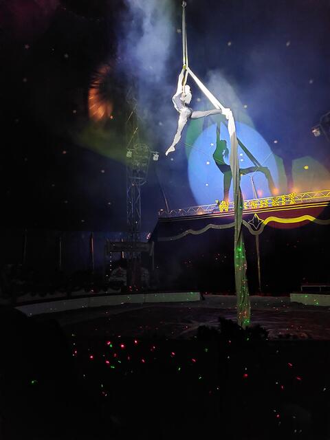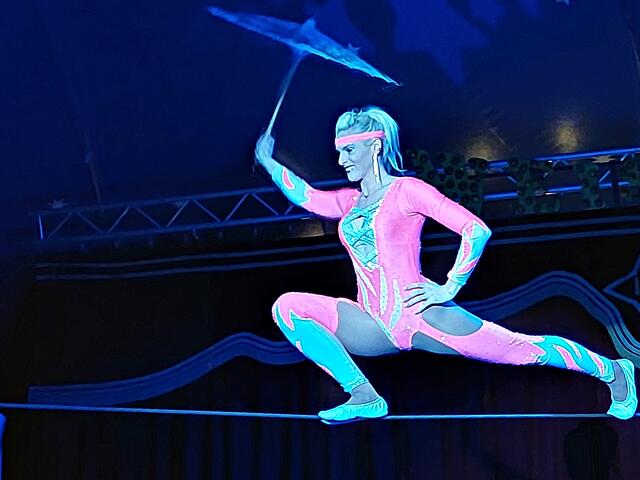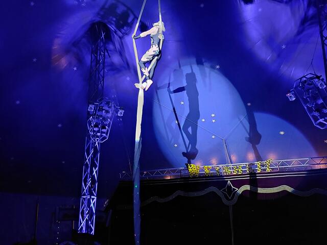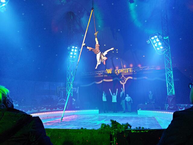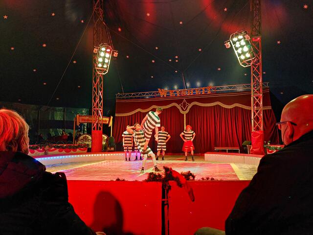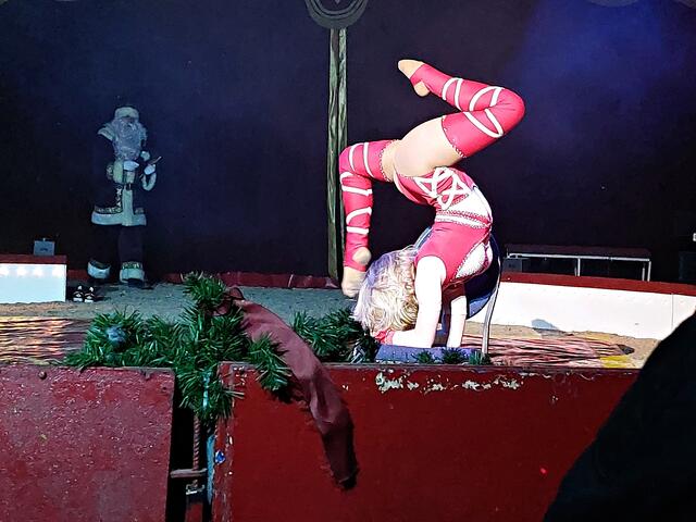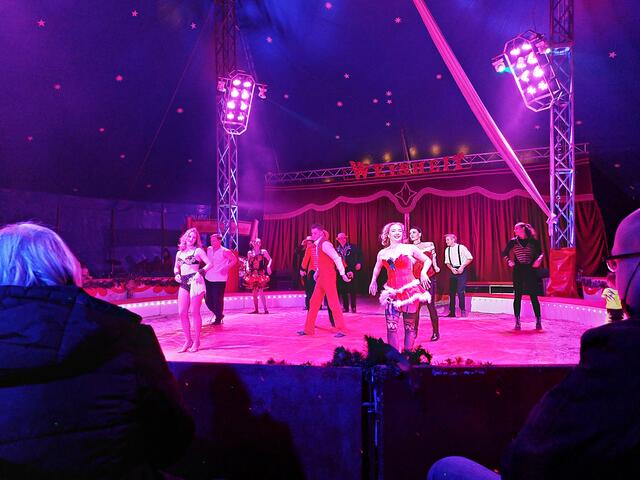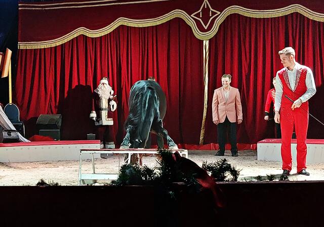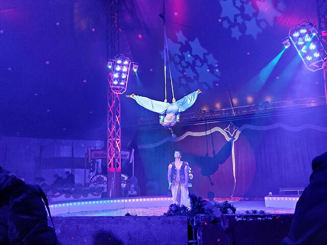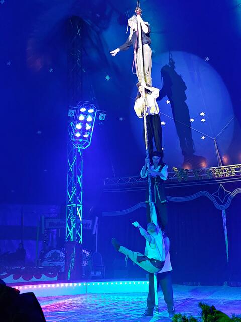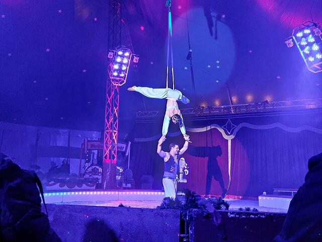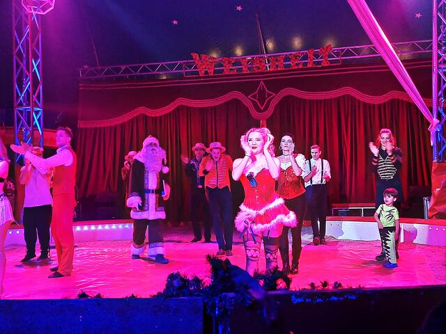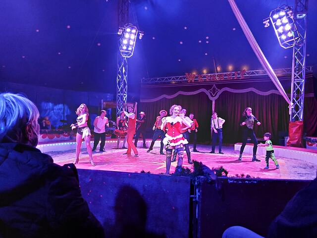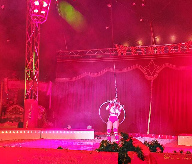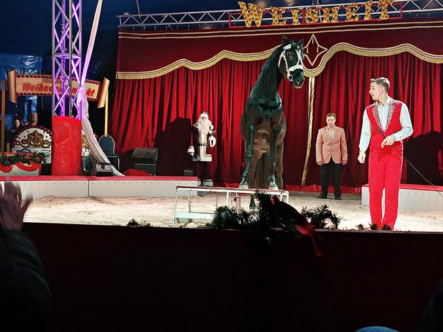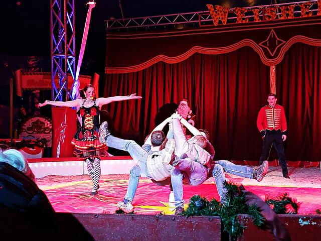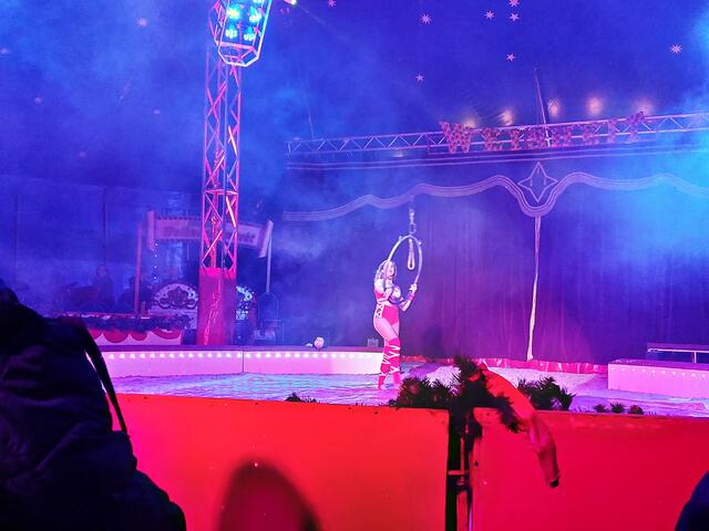 Bereits im Foyer herrschte eine wundervolle Atmosphäre und es war alles noch heimelig weihnachtlich geschmückt und bestrahlt, was sich über den Eingangsbereich bis hin zur Manege fortsetzte. Eine tolle Lightshow mit wie Konfetti schimmernden Effekten stimmte auf das Kommende ein. Alle Beteiligten stürmten in ihren schicken Kostümen herein und begrüßten das Publikum. Es sei der 14. Weihnachtszirkus und man habe ein neues Spitzenprogramm der Superlative vorbereitet. Und dann ging es Schlag auf Schlag mit der einzigartigen Vorstellung. Man sieht, dass in den künstlerischen Darbietungen jede Menge Arbeit und Hingabe drin steckt. Jeder ist in die Arbeit integriert und kennt sich in- und auswendig. Da sitzt jeder Handgriff, jedes Kommando, versteht man Blicke und unterstützt, wo es nur geht.