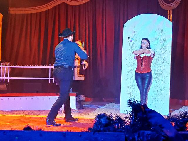 Mit der Musik zu „Fluch der Karibik“ zeigten die jungen Männer an einer kreisenden Stange, was sie akrobatisch zu bieten haben. Es folgte ein Sketch a la „Dinner for one“, nur mit komödiantischem Einsatz von Patrick und Tatjana Weisheit und ohne ausgelegtem Tigerfellkopf. Die „Königin am Ring“ Mary-Ann hing an einem Vertikalseil von der Decke herab und ließ einen nur noch staunen, wie doch mancher Körper von elastischer Biegsamkeit mit Spirale und Spagat sein kann. Dominik Weisheit durfte sein Geschick mit Tieren noch einmal zeigen und entlockte zwei Ponys und einem Rappen Dressurstückchen. Die Spaßmacherin hatte wieder Ausschau nach „Opfern“ gehalten und gleich vier Männer aus dem Publikum ausfindig gemacht. Auf einem Podest zeigte Josefine Weisheit wie gelenkig sie ist. An einem Vertikaltuch, das wie ein langer Schleier von der Decke hing, fand die Akrobatin Janette Weisheit nur mit Händen und Füßen Halt und zeigte sehr elegant ihre Kunst. Mit „Cotton Eye Joe“ kamen die Texanos zu ihrem Einsatz mit Peitschen, die Zeitungen zerteilten und tanzende Lassos um den Körper schwangen bis hin zu Fesselung von Armen und Beinen ohne körperliche Berührung. Der brennende Messer- und Beilwerfer verfehlte Gott sei Dank die junge Dame an der Zielscheibe. Und damit ging es auch zu Ende. Mit bester Unterhaltung, guter Laune und jeder Menge artistischem Können war dies ein gelungener Nachmittag, den ich so schnell nicht vergessen werde.