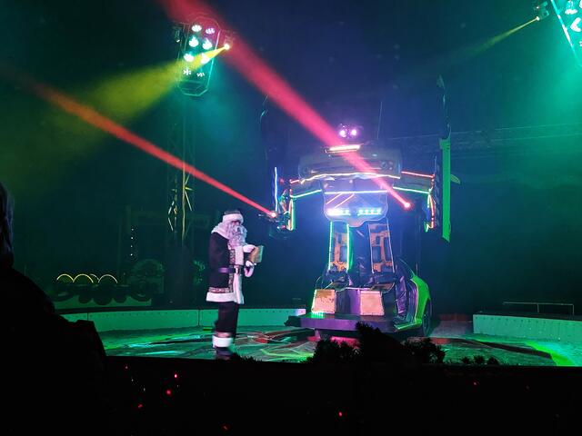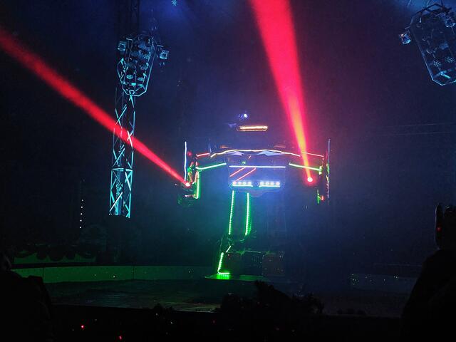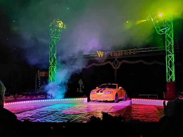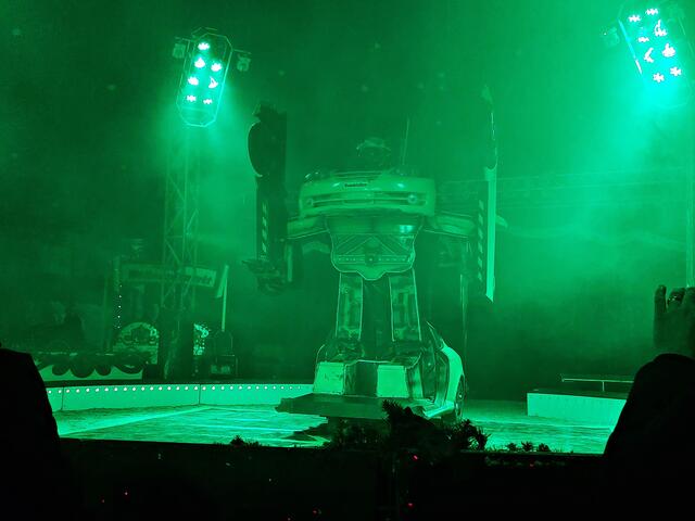 Und dann kam das diesjährige Highlight namens Bumblebee mit fettem Sound in die Manege gefahren. Zuerst war es nur ein gelber schnittiger Sportwagen, der sich jedoch wie von Geisterhand in einen Transformer verwandelte und mit Laserstrahlen in aufrechter voller Größe erstrahlte. Was für ein Abschluss vor der 20-minütigen Pause! Die Pause konnte genutzt werden für den Besuch im Streichelzoo, Nachschub holen bei den Süßigkeiten oder für ein Erinnerungsfoto mit Bumblebee und Würgeschlangen. Solch eine Gelegenheit gibt es so schnell nicht wieder. Die beiden Tigerpythons waren handzahm und hatten bereits ihr heutiges Mahl hinter sich.