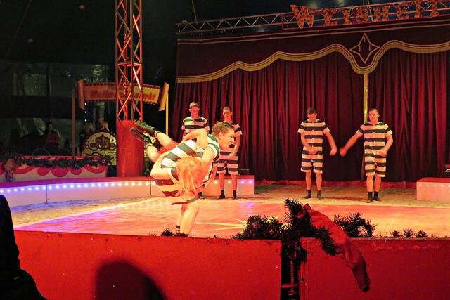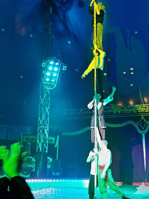 Ein horizontales Seil war gespannt, was eine Balanceakrobatik bedeutete. Unglaublich, welche Figuren darauf Janette Weisheit performte. Dominik Weisheit hat ein Händchen für Tiere. Nach der Pferdedressur hatte Lama Fernando seinen Auftritt und es klappte wie am Schnürchen. Sogar die beiden kleinen Enkel des Seniors spielten schon eine „Muppet Show“. Es war unglaublich, welche Körperbeherrschung bereits der eine Nachwuchsartist auf einer Hand balancierend oder mitten im Schwung stehend hatte. Da stockte schon mal kurzzeitig der Atem. Den nächsten Auftritt hatte Patrick Weisheit als „Der Herr der Ringe“, der aber nicht nur mit Ringen, sondern auch mit Keulen, beleuchteten Bällen und brennenden Fackeln jonglierte und das mit einer rasanten Geschwindigkeit. Mit dem „Radetzki-Marsch“ betraten 6 gestreifte „alte Kameraden“ die Manege, die jede Menge Spaß und Akrobatik für die Zuschauer dabei hatten. Die Spaßmacherin hielt mit ihrer Trillerpfeife im Publikum Ausschau nach freiwilligen Protagonisten. Zwei Mädchen sollten Springseil springen und eines davon sogar mit verbundenen Augen. Naja, ein kleiner Trick war dabei. Die Hochseilkunst des Paares Jasmin und Aladin war perfekt einstudiert, voller Ästhetik, Harmonie und hohem Körpereinsatz. Die Hundedressur von Dominik mit zwei niedlichen gehorsamen Hunden namens Loui und Nala klappte auch spielerisch und zur Belohnung gab es immer Leckerlis. Die Spaßmacherin hatte dieses Mal ihren Auftritt mit der Waschmaschinen-Erfindung.