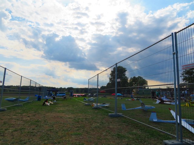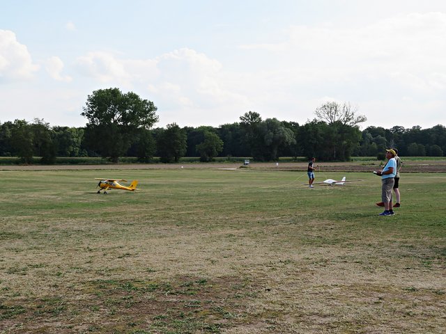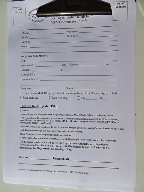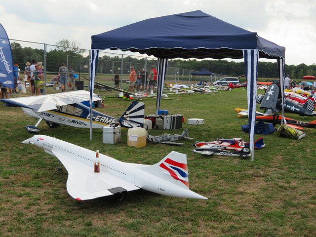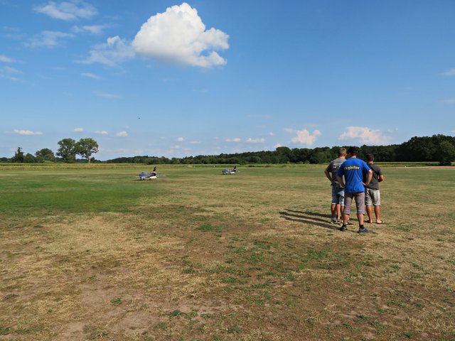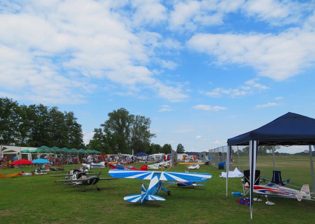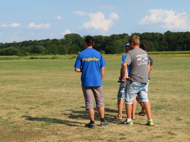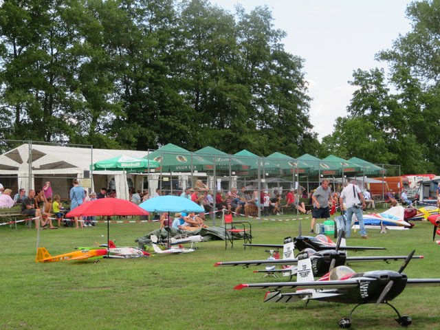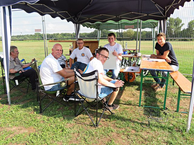 Unter einem Pavillon sitzen die Männer für die Anmeldung und Flugeinteilung, zu denen ich mich setze. Im Gespräch mit Vereinsmitglied Bastian Breßler erfahre ich, dass es insgesamt 60 Piloten und 80 Flugzeugmodelle von minimal 1 Meter Spannweite bis hin zu 4,20 Meter Spannweite gibt. In dem Zelt liegen Anmeldebogen aus, die von den Starten ausgefüllt werden müssen, damit der Sprecher entsprechende Infos für seine Ansagen hat. Letztes Jahr hatte der Verein 40-jähriges gefeiert. Circa 400 bis 450 interessierte Besucher lockte dieses Fest bereits am heutigen Tage an. Neben der großen Kinderhüpfburg gibt es auch allerhand für das leibliche Wohl, wie Kaffee, Kuchen, Eis, allerlei Getränke, Grillgut, Wurstsalat und große Salatteller, das alles von den ehrenamtlichen Helfern des Flugvereins organisiert wurde.