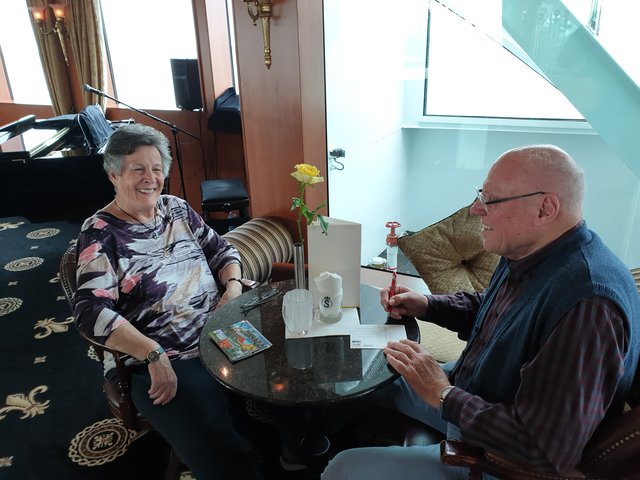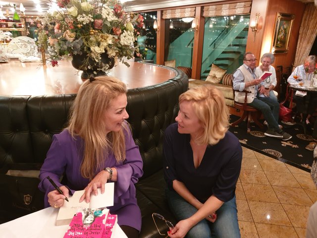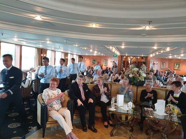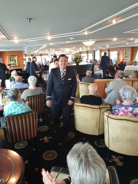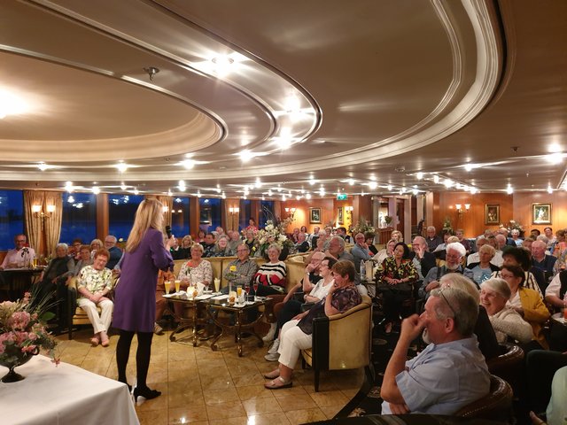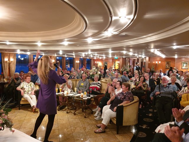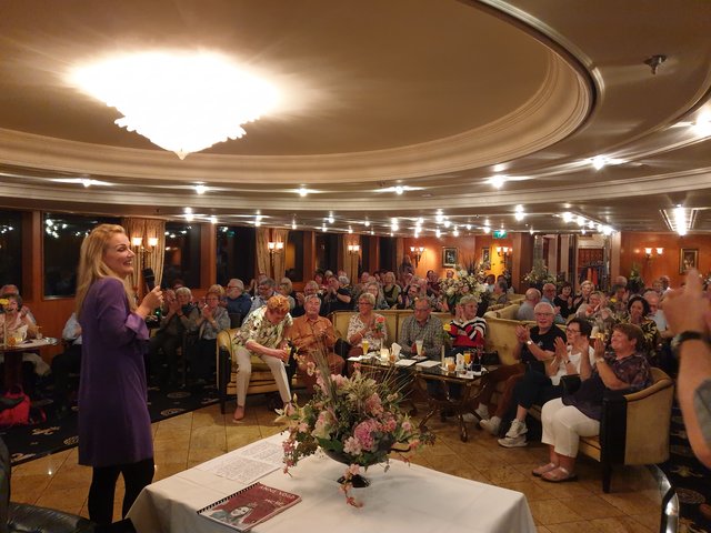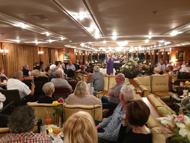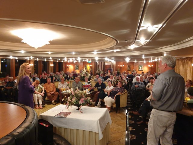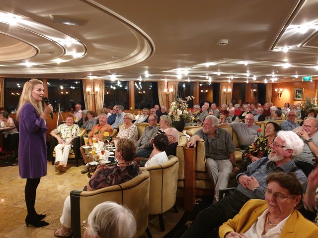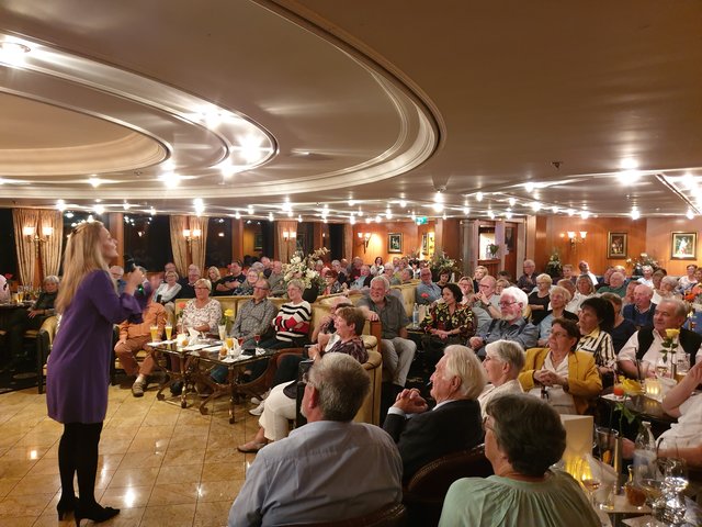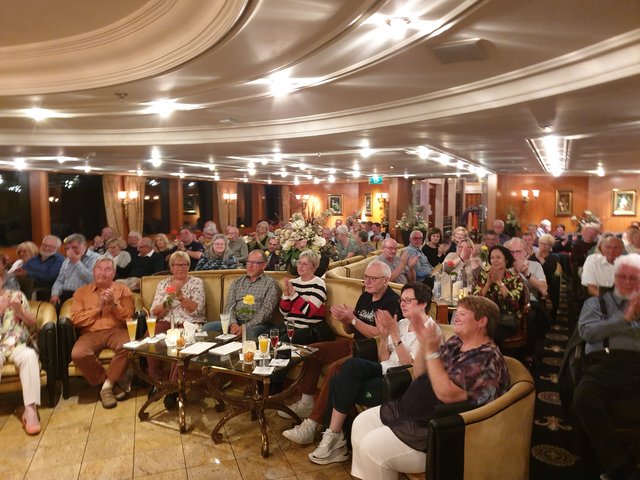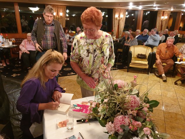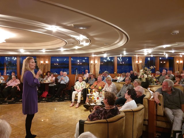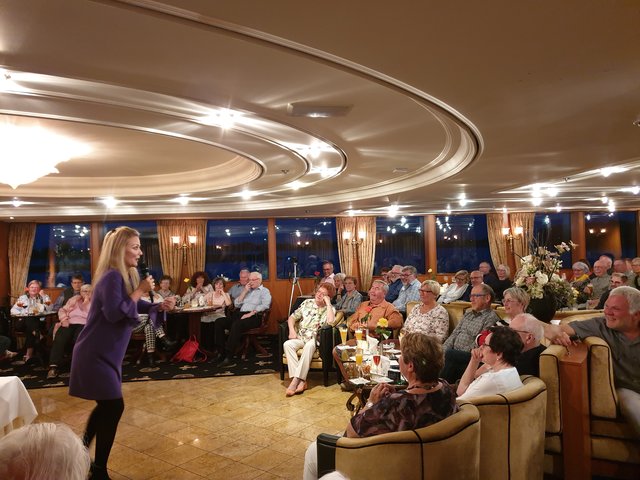 Der bewährte Reiseleiter Lutz Bork, der für diese Leserreise wieder engagiert wurde, sorgte mit sonorer Stimme für eine beruhigende Atmosphäre und ließ erst gar keine Hektik an Bord aufkommen, wenn einmal Probleme auftauchten. Das hervorragend zusammenarbeitende Gesamt-Team überließ nichts dem Zufall und sorgte für einen reibungslosen Verlauf. Das Abendprogramm an Bord ließ die Tage jeweils in entspannter und heiterer Atmosphäre ausklingen. Stargast Anne Vogd, vielen bereits bestens bekannt durch ihre Serie „Volle Kanne Anne“ im SWR3 und vielen Auftritten in der Rhein-Neckar-Region, sorgte an zwei Abenden für allerbeste Unterhaltung, die pointenreiche Lesung aus ihrem Buch "Ich hab's auch nicht immer leicht mit mir" war ein humoristisches Highlight und wurde mit begeistertem Beifall bedacht. Die sympathische und stets gut gelaunte Mitreisende war auch sonst stets ansprechbar und gewann mit ihrer aufgeschlossenen Art viele neue Fans.