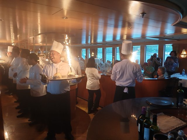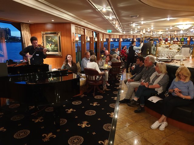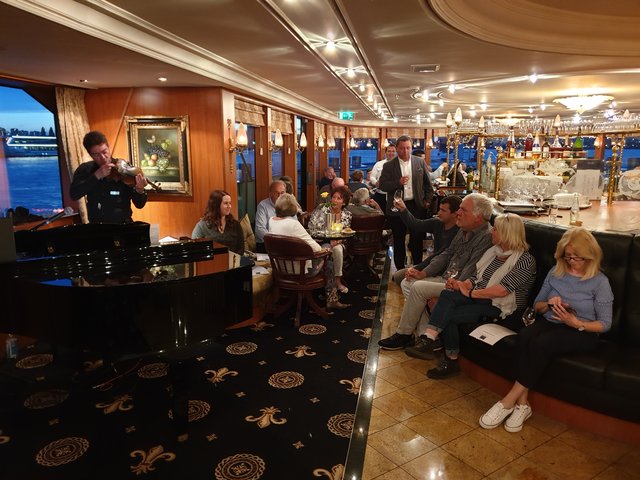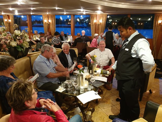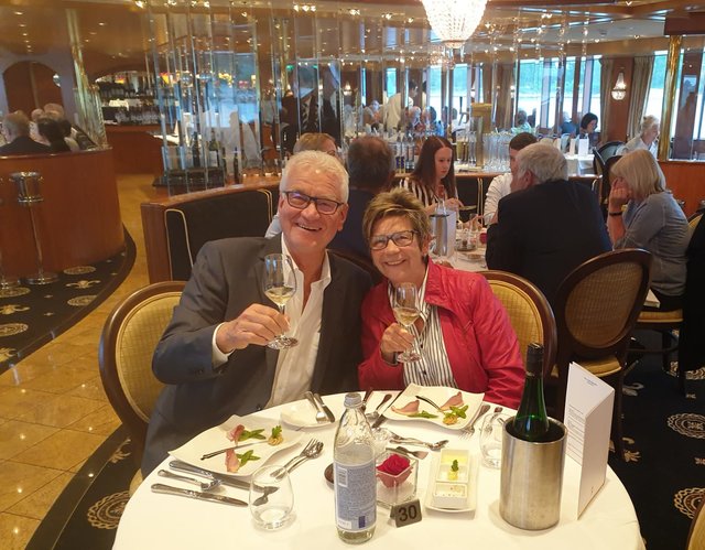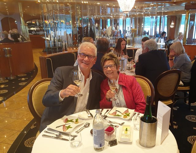 Die Swiss Tiara der Schweizer Reederei Scylla AG bot mit komfortablen Kabinen und bis zum Boden reichenden Panorama-Fenstern ein anheimelndes Wohlfühlambiente, großzügige und lichtdurchflutete Räumlichkeiten luden ein zum gemütlichen Verweilen und Genießen der exzellenten Verpflegung und ausgesuchter Weine, das famose, stets fröhliche und immer aufmerksame Service-Team sorgte rund um die Uhr dafür, dass es an nichts fehlte und alle sich so richtig wohlfühlten.