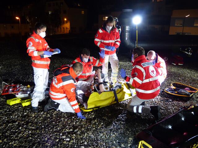 Zu sehen war auch, wie personalintensiv die ganze Sache bei einer solchen Reanimation ist. In der Übung arbeiteten mehrere Personen am Patienten, weitere standen auf Bereitschaft und kümmerten sich um die Kommunikation mit der Feuerwehr für den Transport nach unten über die Drehleiter.