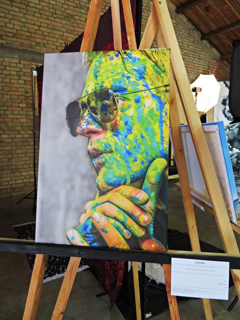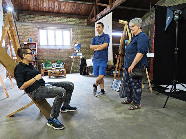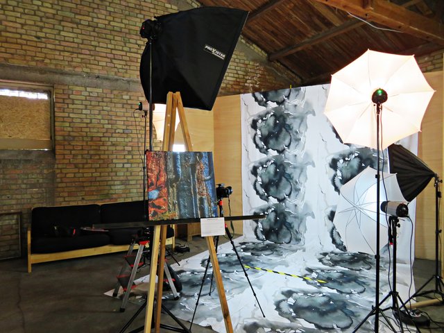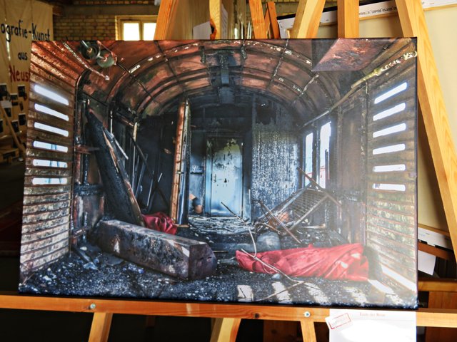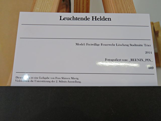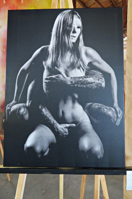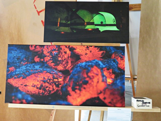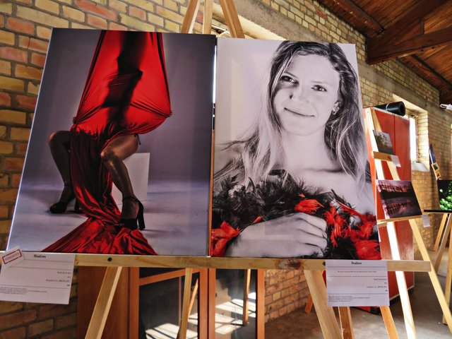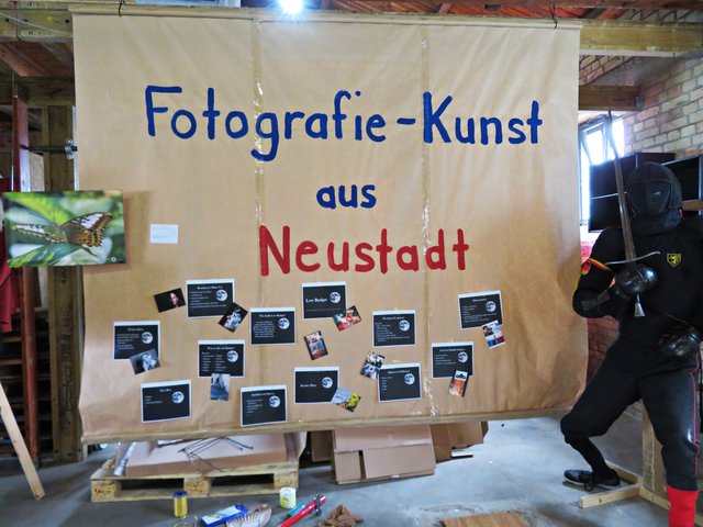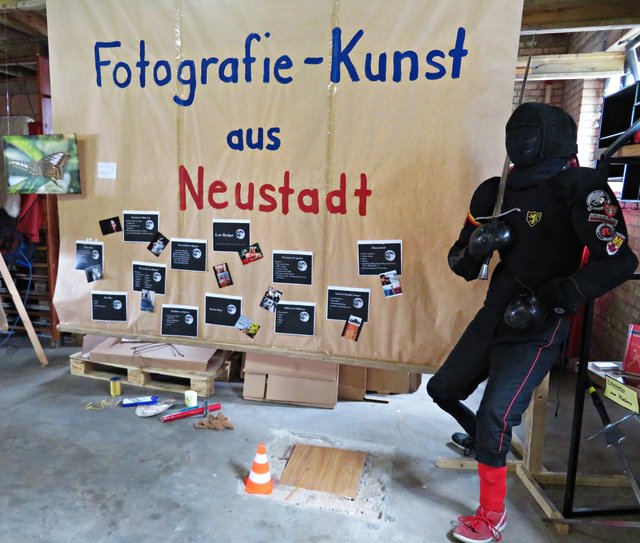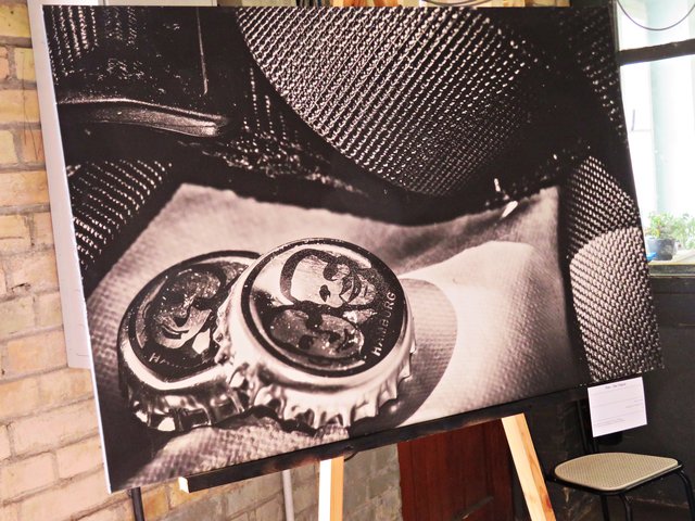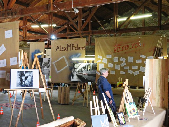 Außer ihr sind noch 4 Künstler am Start, wie zum Beispiel Alexandra Müller (AlexM Pictures), die aus Wien kommt, jedoch in Köln lebt. Es ist eine Bekannte, die sie in Heilbronn durch das Fotografieren kennengelernt hat. Vor Ort ist auch Carsten Ehrenberg, der die vielen ausgestellten Möbel hergestellt und gestiftet hat. Ich sehe außergewöhnliche Tisch- und Deckenlampen, Garderobe, Tische und Sitzmöbel, alle aus Holz, teils geflammt, lasiert und unlasiert, vorwiegend aus Paletten (https://www.facebook.com/CreativeHomeFactory/) Florian und Joachim Stoner (Photos4Fun), Jakob und Jasmin Marohn treten hier ebenfalls nicht hauptberuflich als Künstler auf, deren Leidenschaft die Fotografie ist.