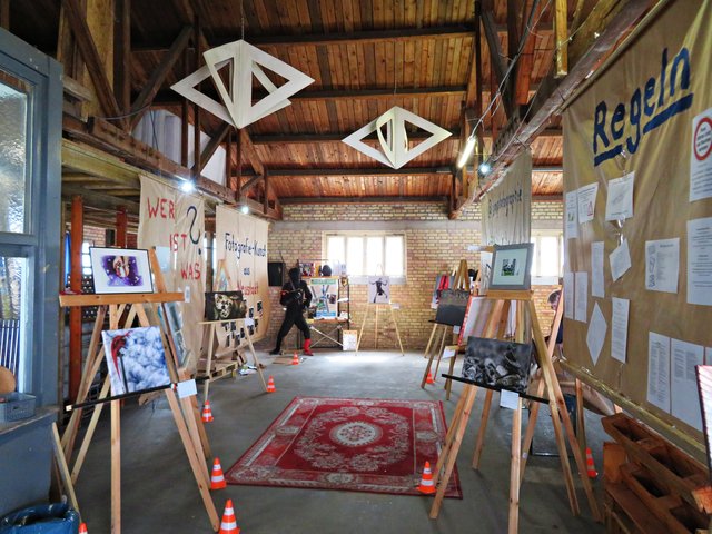Hier in der von den Pfälzer Schwertlöwen zur Verfügung gestellten Halle sind alle Stilrichtungen vertreten – von Porträts über Landschaften, knall bunt über schwarz-weiß und Makro bis abstrakt ist querbeet alles dabei. Jeden Tag gibt es hier ein anderes Special wie zum Beispiel Fotowettbewerb und Workshops. So stehen für Dienstag Geschichtentour durch die Kunstwerke (jeder darf SEIN Bild, in das er sich verliebt hat, an die Pinnwand heften), Donnerstag Livegame „großes Rätsel“, Samstag ein Fotowettbewerb und zum Abschluss für Sonntag die Versteigerung auf dem Programm.