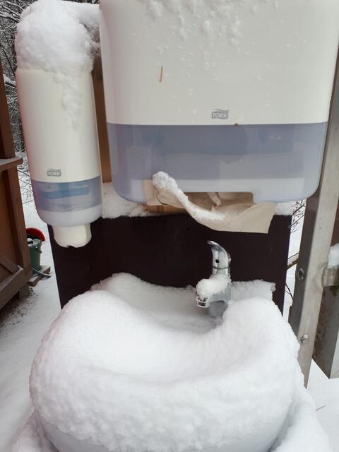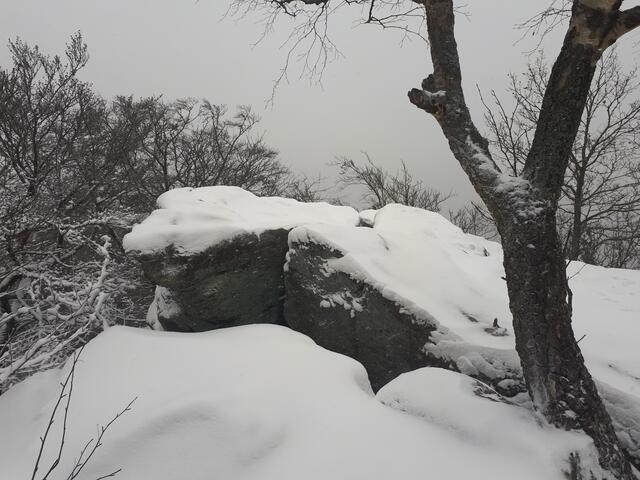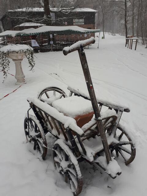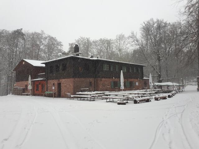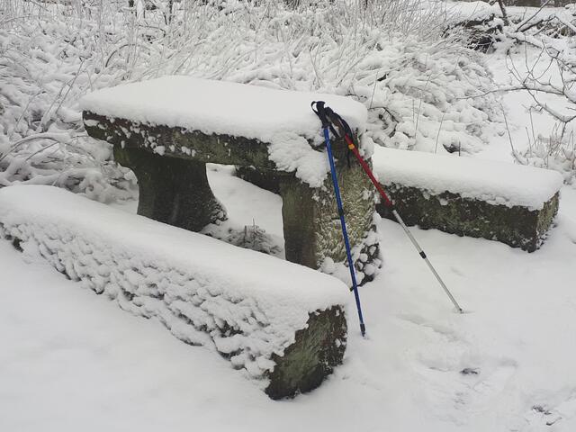 Es ist kein Tiefschnee, der unter den Bergschuhen knirscht. Aber so 10 Zentimeter könnten es schon sein. Und es werden immer mehr, je höher ich komme. Ich folge blau-weiß und bin nach 5 Kilometern an Lambertskreuz. Totenstille. Corona hat seine Spuren hinterlassen. Vorbei an einer eingeschneiten, vereisten Hygienestation. Seit dem zweiten Lockdown schlummert sie ihren einsamen Dornröschenschlaf. Mich gruselts. Schnell weiter, der Markierung roter Balken folgend. Welchen der Sieben Wege nehm ich am gleichnamigen Wegkreuz? Ach ja, ich wollte ja zum Drachenfels, die berüchtigte Südspitze erzwingen und dann mit den Skiern runter.