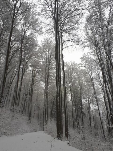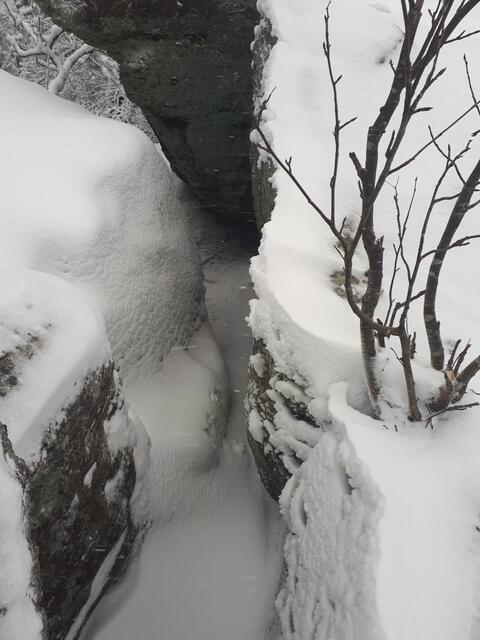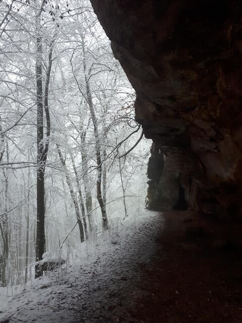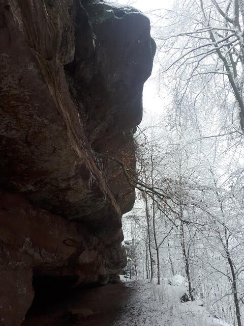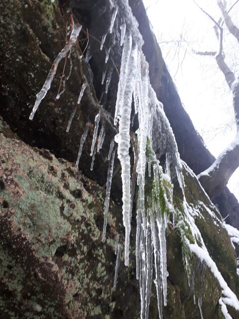 Schön wedeln im frischen Pulverschnee. Wie einst Hans Kammerlander vom Everest. Nix wedeln. Träum weiter lieber Bergfex. Steil, auf engem, rutschigem Pfad geht's hoch, die grünen, bis auf die Zähne mit Eiszapfen bewehrten Wände sind mein Begleiter. Mühsam kämpfe ich mich voran. Jetzt bin ich auf dem Plateau. Null Sicht, stattdessen Schneesturm. Nanu, Gletscherspalten im Pfälzer Wald? Ich traue meinen Augen kaum. Eine neue Eiszeit? Wo bin ich hier?
