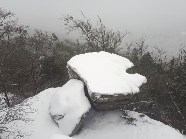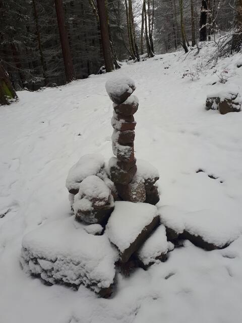 Pfalz. So ein Pech. Skier nicht dabei. Hätte sich gelohnt. Heute Vormittag ist der Drachenfels dran. Es schneit ununterbrochen. Ich starte vom Parkplatz Alte Schanze, Nähe Rotsteig. Nicht nur Lindenberg ist eingeschneit. Das ganze Tal. Aber nicht das Tal ruft heute. Aufi, aufi, der Berg ruft.