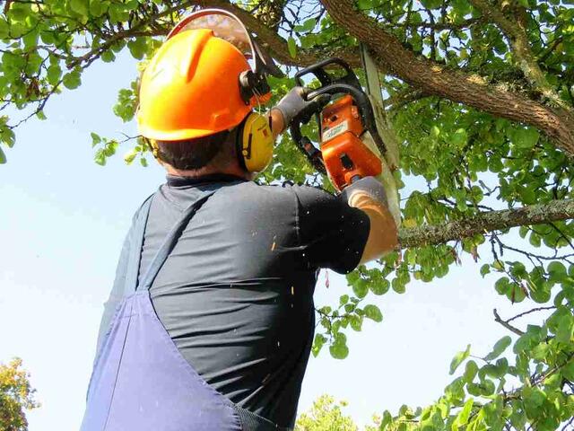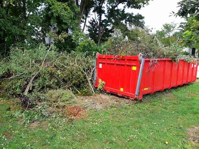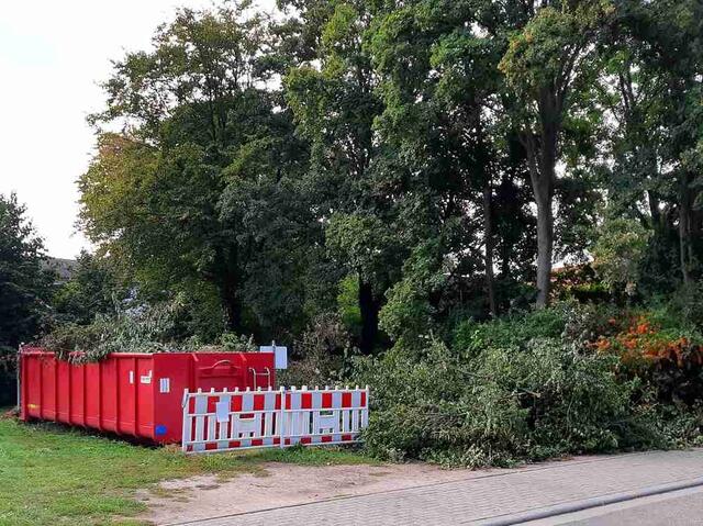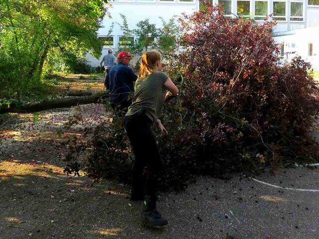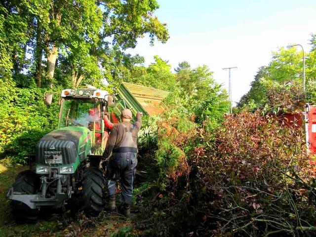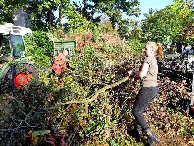 Den ganzen Morgen war das Surren der Sägemotoren zu hören, die abgeschnittenen Äste wurden mit Astscheren weiter zerkleinert und dann zum Abfallcontainer gebracht, der aber bei weitem nicht ausreichte, um die weit über 100 Kubikmeter Grünschnitt aufzunehmen. Mit einem Traktorgespann wurde ebenfalls Grünschnitt zum Sammelplatz transportiert.