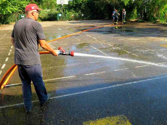 Auch überhängende Äste vom Friedhofsgelände wurden abgesägt, da diese immer wieder für Beschädigungen bei LKWs und landwirtschaftlichen Geräten sorgten. Zum Abschluss wurden Schulhof und Weg noch gründlich mit Wasser gereinigt und nebenbei der Basketballkorb repariert, bevor sich die Helfer im DGH zum abschließenden gemeinsamen Mittagessen trafen um den arbeitsreichen Morgen noch einmal Revue passieren zu lassen.