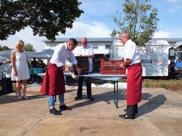 Obwohl der Regen den Oberhäusern gelegentlich einen Strich durch die Rechnung machte, konnten zahlreiche einheimische und auswärtige Besucher ein bestens organisiertes und rundum gelungenes Dorffest genießen. Mit Grußworten und helfenden Händen beim Fassanstich dabei: Bürgermeister Martin Büchner, Pfarrerin Charlotte Hoffmann und die beiden Dorffestchefs.