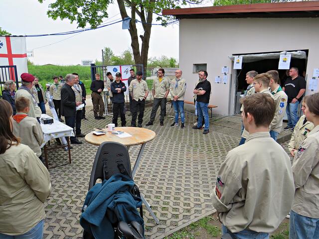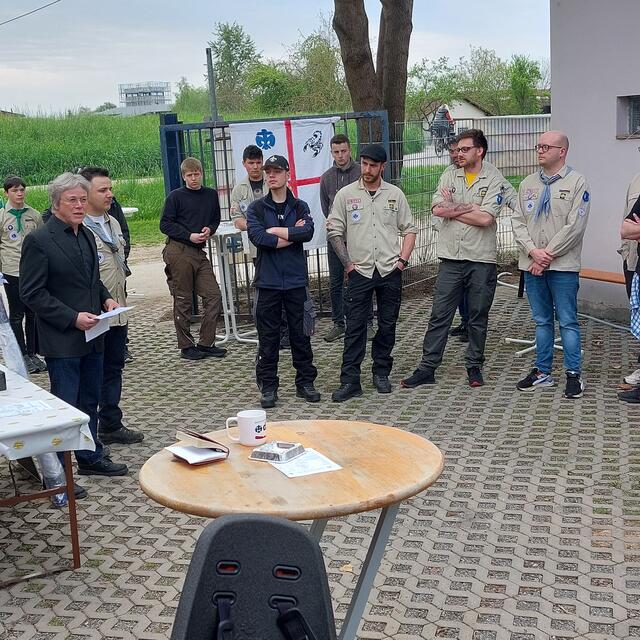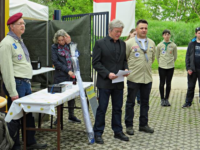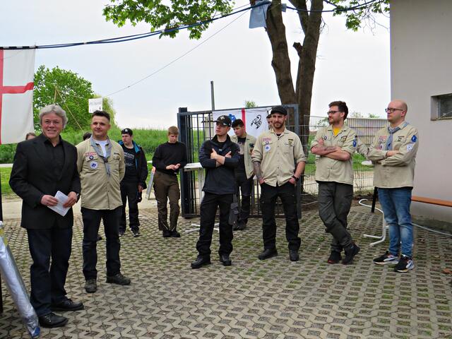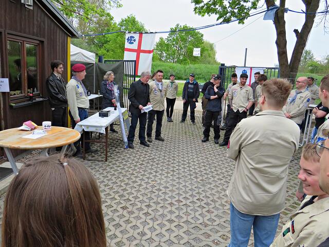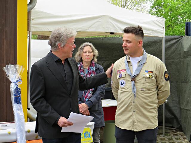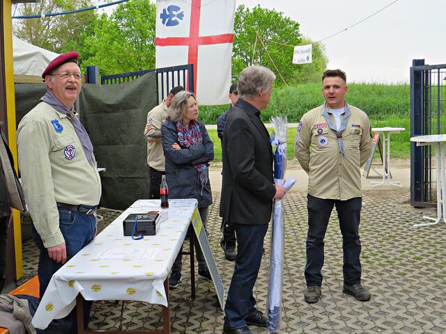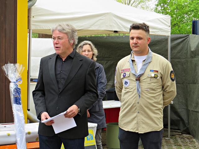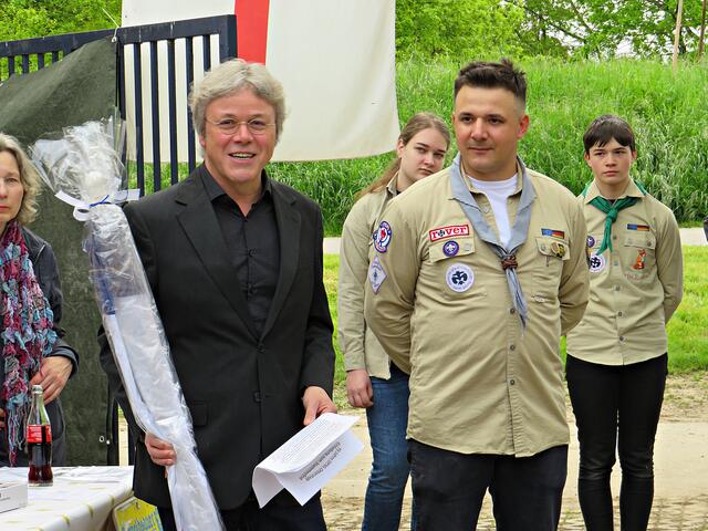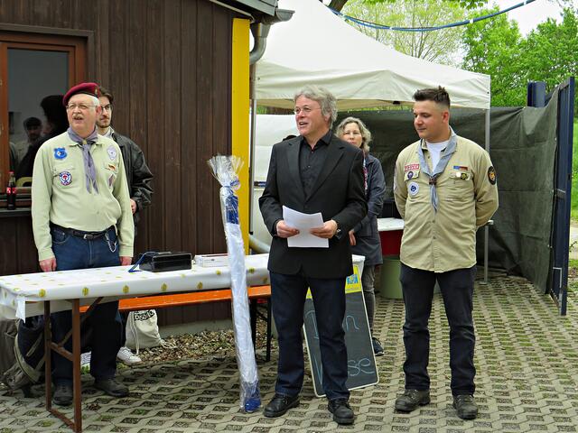 Kurz nach 10.00 Uhr ging es los mit der Ansprache des 1. Vorsitzenden. Der Ortsbürgermeister Bernd Zimmermann mit Gattin waren auch schon da. Er hatte nicht nur eine Überraschung dabei, nämlich eine Otterstadter Fahne und auch noch einen Zuschuss für den Verein, den er in einem Umschlag überreichte. Es war ein kleiner Obolus für die hervorragende Jugendarbeit! Die Pfadfinder seien im Ort sehr engagiert, egal ob beim Karpfenfest, Weihnachtsmarkt oder Spielefest. Auch als Nikoläuse überraschten sie am 06.12. die Kinder im Ort. Er bedankte sich auch im Namen des gesamten Gemeinderates zum 70-jährigen Bestehen und wünschte „Allzeit gut Pfad“.