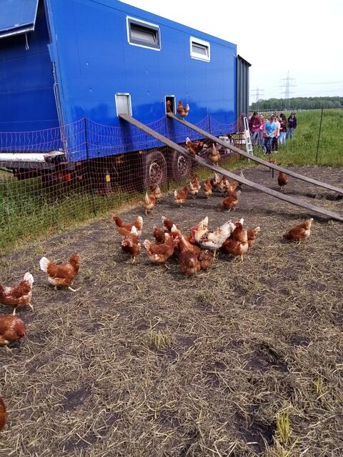Neben Biologie und Erdkunde / Geografie steht bei diesem Projekt natürlich auch die Verbraucherbildung im Vordergrund. Während die Kinder noch bei den freilaufenden Hühnern waren und auch ein Huhn streicheln durften, sah man die Milchkühe, wie sie zur Weide wanderten. („Ich seh´ die Milchstraße“, kalauerte ein Schüler). Da konnte man eine ältere Kuh beobachten, die es sich nicht nehmen ließ, bei diesem schönen Wetter auch den Stall zu verlassen, obwohl sie sehr gebrechlich wirkte. Uns wurde mitgeteilt, dass Emma 10 Jahre alt sei und immer noch Milch gäbe. Ein Bulle durfte auch mit auf die Weide, das spart die künstliche Besamung. Für die Kinder war klar: Dies ist ein ökologisch geführter Bio-Bauernhof, den Tieren geht es sehr gut, sie haben Freigang, die Kälbchen haben ein weiches Fell, das Futter ist frisch und wird selbst produziert….. Tatsächlich handelt es sich in seiner Ausrichtung um einen konventionell geführten Betrieb.