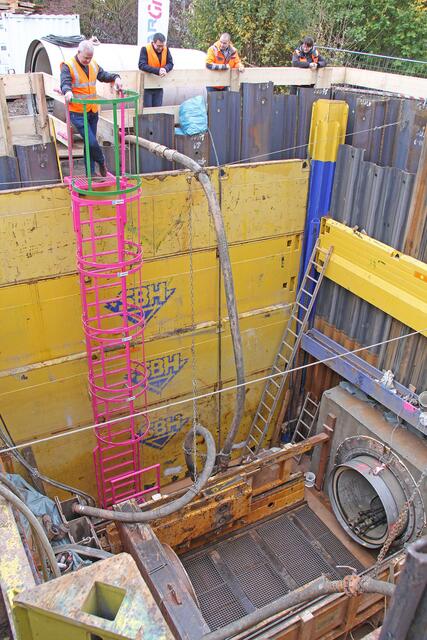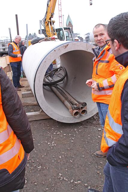 RAMSTEIN-MIESENBACH. Die Tiefbauarbeiten zum Neubau des Regenüberlaufs „Schulstraße“ in Ramstein gehen zügig voran. Die vergangenen Tage wurden die Rohre für die Entlastungsleitung unter der Bahnstrecke verlegt. In der großen Baugrube neben der inneren Umgehungsstraße, gegenüber dem Netto-Parkplatz, wurden die drei Meter langen Rohre nacheinander in Richtung Flurstraße verlegt. Dabei fräst sich ein Bohrer durch das Erdreich, das direkt nach oben abtransportiert wird und gleichzeitig werden die Rohre durchgepresst. Anhand der gewogenen Erdmasse kann man jeweils feststellen, ob tatsächlich nur das Erdreich für die Rohre abtransportiert wurde.