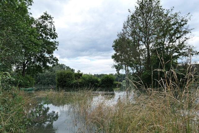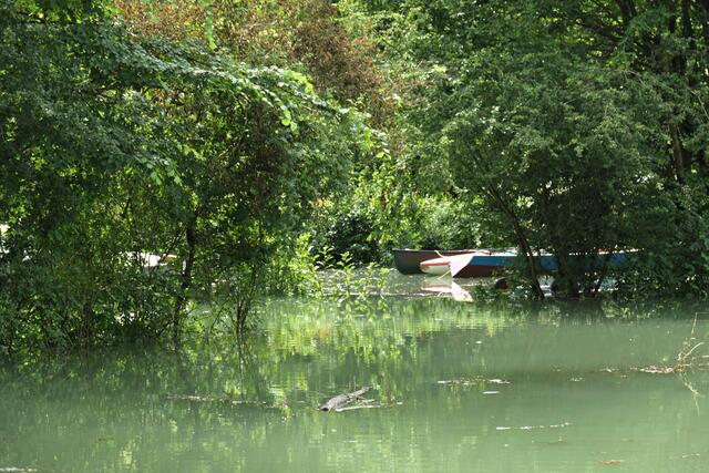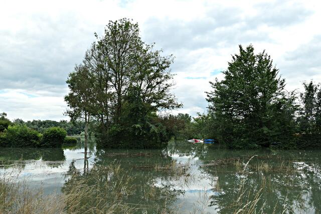 Waldsee. Viel heute im Radio gehört über den Hochwasserpegel und die Katastrophen in Nordrhein-Westfalen und Rheinland-Pfalz mit mehreren Toten und Vermissten durch die andauernden starken Niederschläge. Wie hoch steht das Wasser wohl bei uns am Altrhein? Auf dem Weg zur Altrheinklause sah man schon die ganzen Parkplätze voll mit Wohnwägen, die wahrscheinlich noch rechtzeitig an Land geholt wurden bevor der große Regen einsetzte. Für die kleinen fest gebauten Hütten sieht es allerdings schlecht aus, denn die stehen voll im Wasser. Vom Damm aus sieht man das ganze Ausmaß der Überschwemmung. An der Schranke, wo eigentlich Autos stehen, um zu ihren Grundstücken zu gelangen, stand heute ein Kanu. Die Kanutin konnte praktisch direkt vom Auto ins Wasser abladen und losfahren. Wie hoch wird der Pegel am Rhein noch steigen? Momentan schwimmen praktisch die Fische auf Land.
