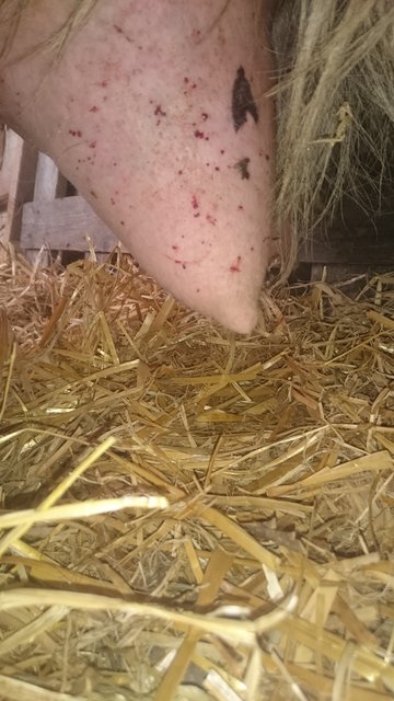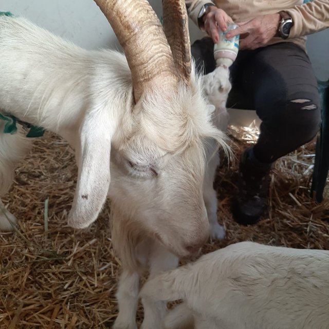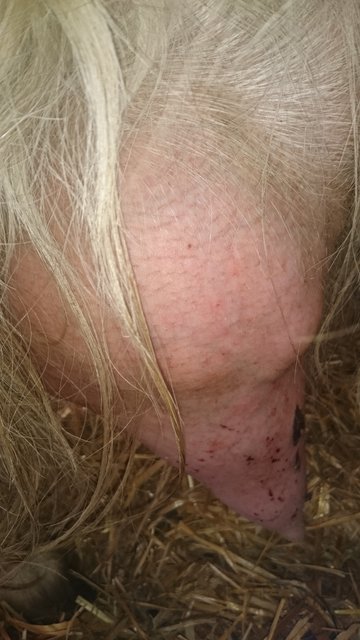 Leider wurde sie tragend und nach der Geburt von Hanni und Hetty explodierte ihr geschundener Euter derart, dass von Anfang an klar war, dass sie ihre Babys nicht säugen könnte. Normalerweise beginnt die Decksaison im Oktober, also hatte ich gehofft, dass sie nicht mehr tragend werden würde. Ihr Euter ist durch mehrere Euterentzündungen stark vergrößert und deshalb hatten wir jetzt wieder einen Problemfall. Ihre Gesundheit war auch noch nicht so stabil, wie die der anderen Tiere, denn leider dauert es 1-2 Jahre bis sie so proppper sind, wie die ,die schon seit 4 Jahren bei mir sind. Die Zwillinge haben deshalb auch ein paar Defizite, die ich sofort mit Vitaminen Selen und Calizium behandelt habe.Wir haben sie dann gemolken, damit die beiden die wichtige Biestmilch bekommen. Es wurden also Flaschenkinder. Das Euter hatte ich jetzt erst mal äußerlich mit Kokosöl behandelt um der Haut die Spannung zu nehmen. Wir behandelten die Entzündung homeophatisch , was sehr gut funktionierte. Leider bekam sie völlig unerwartet eine üble Infektion, die sie trotz einsetzen von Antibiotika nicht überlebte. Auch viele Menschen, die ein geschwächtes Immunsysthem haben sterben daran.