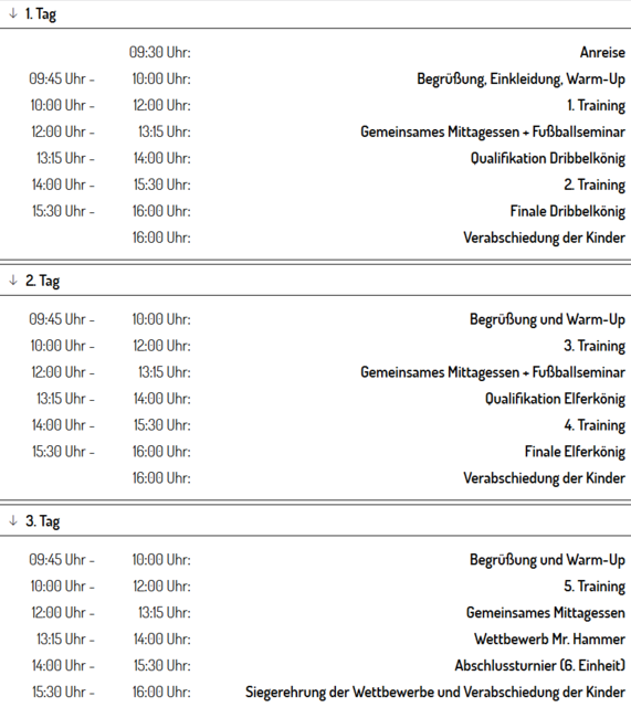Die Teilnahmegebühr für die 3 Tage Fußball pur beträgt 135,00 €. In der Kursgebühr sind 6 Trainingseinheiten, die Verpflegung, eine Ausstattung mit Trikot, Ball und Trinkflasche vom Ausrüster PUMA und eine Teilnehmerurkunde sowie Medaille enthalten.