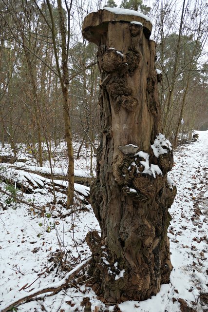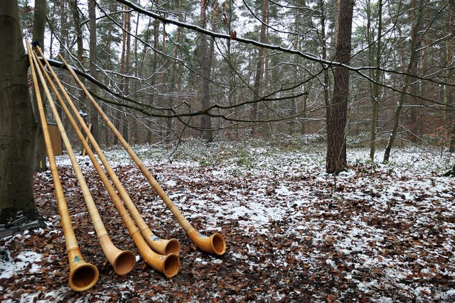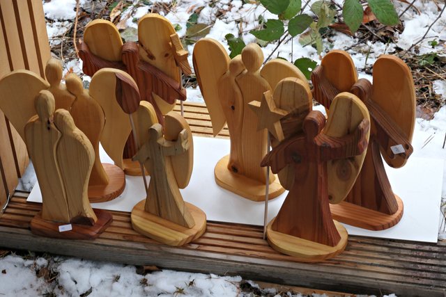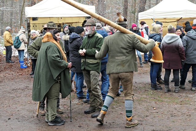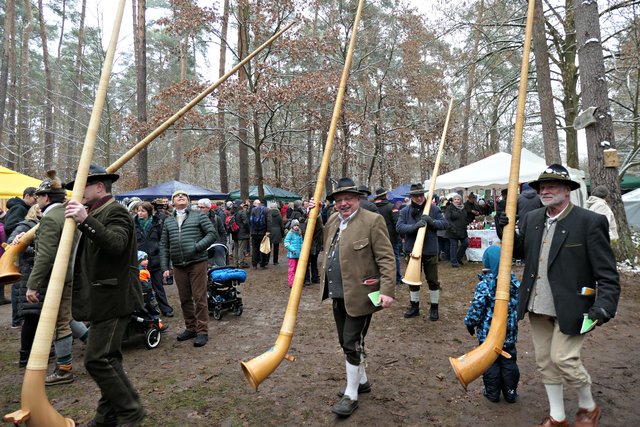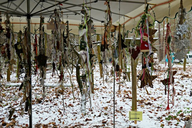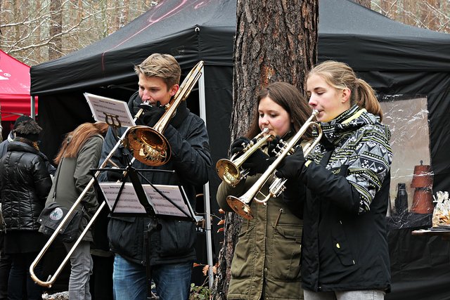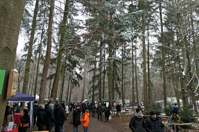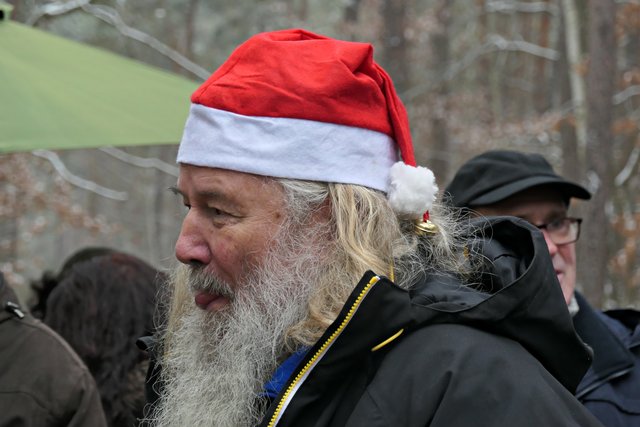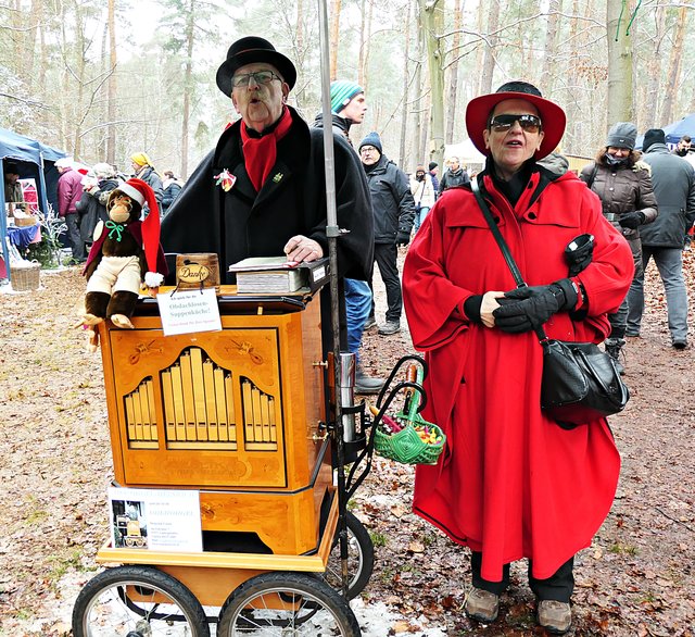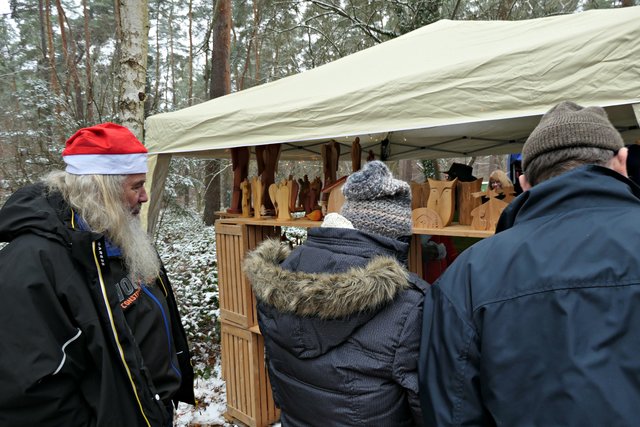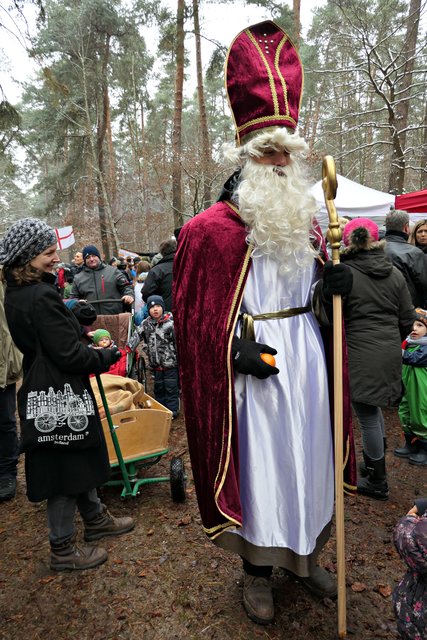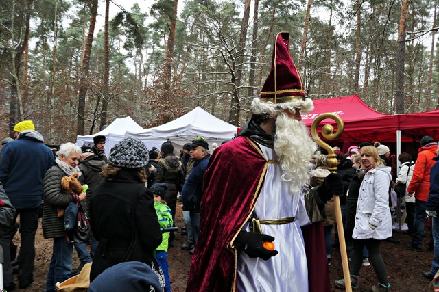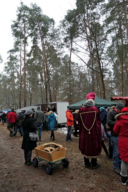 Jeder, der noch kein Geschenk gefunden hatte, bekam heute die Möglichkeit, etwas Passendes auszusuchen. Die Auswahl war riesig. Zudem gab es auch noch musikalische Darbietungen, wie die von den „Kurpfälzer Alphornbläsern“ mit Alpenklängen im Winterwald, der „Blaskapelle Dudenhofen“, den Drehorgelspielern und dem Trio mit jungen Trompetern. Der hochgewachsene Nikolaus mit reizender Assistentin begegnete mir. In seinem Sack hatte er jede Menge Mandarinen, die er an Kinder verteilte. Da es wirklich sehr voll im Wald war, benutzten die Besucher sogar abgesägte Baumstämme, um ihre kulinarischen Delikatessen abzustellen.