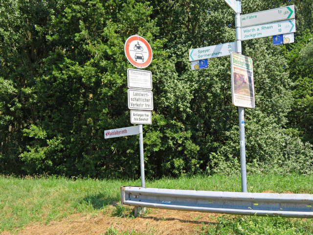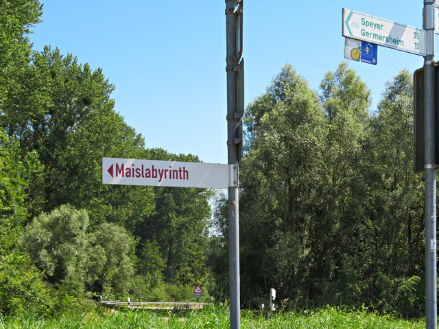 Zu finden ist das Maislabyrinth bei Familie Schardt am Seehof, 76774 Leimersheim, zwischen Germersheim und Wörth. Lassen Sie sich nicht beirren, wenn Sie an den Damm kommen und das Einfahrt-Verbotsschild sehen. Anders kommt man nicht hin und das geht schon in Ordnung.