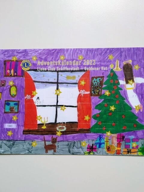 Bereits 2021 waren die Vorbereitungen für den Adventskalender des Lions Club Schifferstadt Goldener Hut gestartet. In einem Malwettbewerb an der Grundschule Nord brachten die Schülerinnen und Schüler ihre Interpretationen zur Weihnachtsgeschichte zu Papier. Aus über 40 eingereichten Zeichnungen wurden die drei besten von einer Fachjury, bestehend aus drei bildenden Künstlern von Schifferstadt unter Leitung von Frau Dr. Bury, im Rathaus ausgewählt. Das Gewinnerbild, gemalt von Anna May, ziert nun den Adventskalender.
