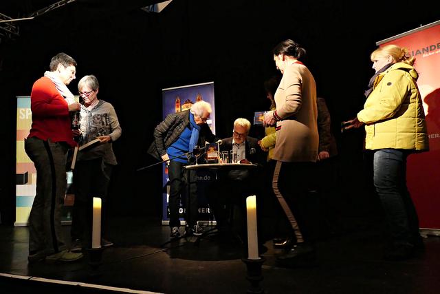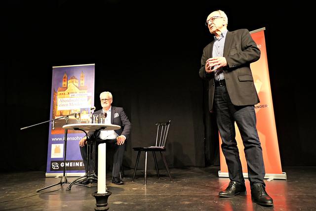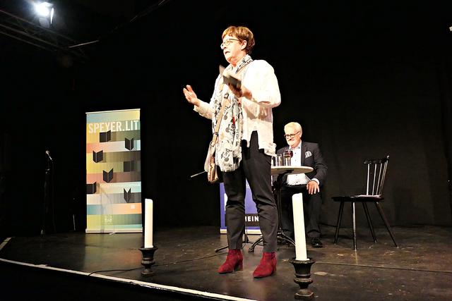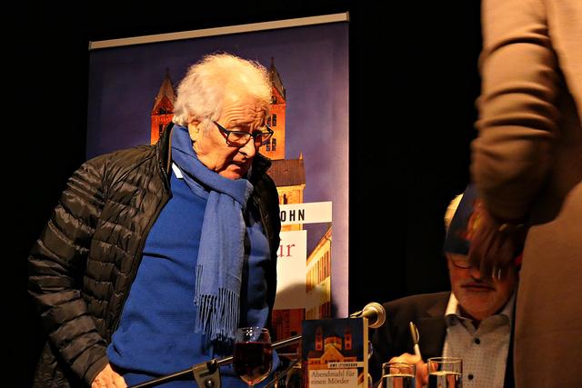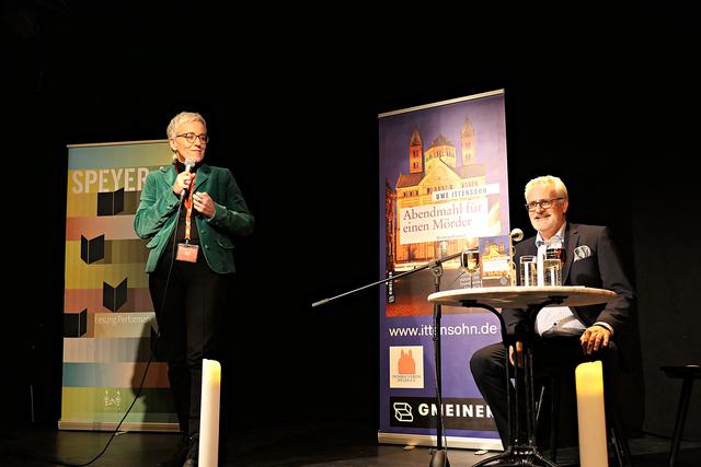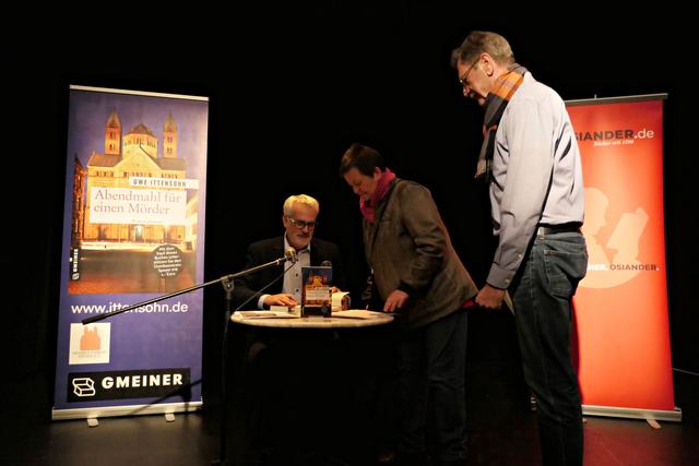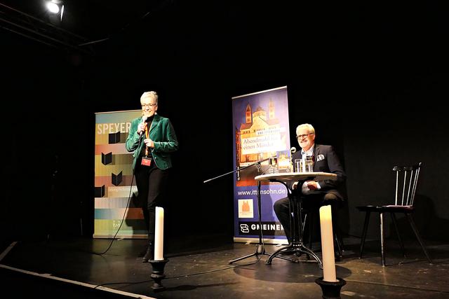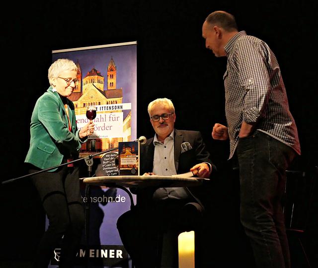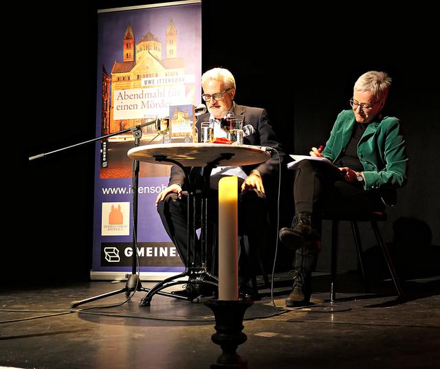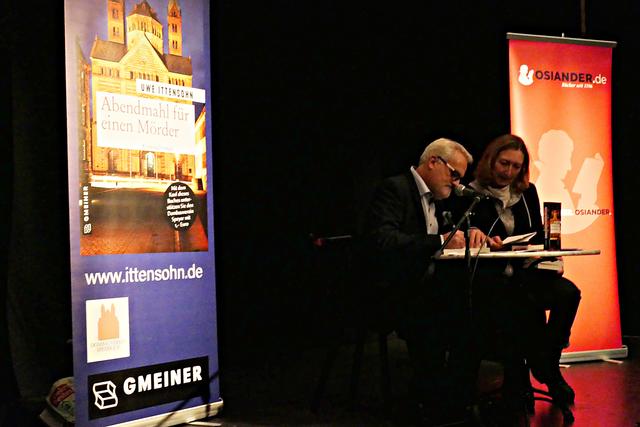 Als Erste betrat Monika Kabs die Bühne und gab preis, dass sie Uwe Ittensohn vor 3 Jahren in einer Buchhandlung getroffen habe und ihn fragte, wie es wäre, einen Krimi in und um Speyer zu schreiben. Aus diesem Gespräch entstand dann das Erstlingswerk „Requiem für den Kanzler“. Frau Dagmar Strubl (Osiander-Buchhandlung), die auf der Bühne neben dem Autor zur Fragestellung Platz nahm, stellte Ittensohn als literarischen Lokalmatador vor. Im Herbst 2019 hatte Speyer bereits eine Autorenlesung mit mehreren Autoren, unter ihnen auch Ittensohn. Es gab eine Kostprobe von 7 Kapiteln aus 43. Und dann ging es los!