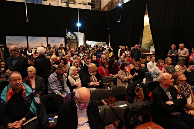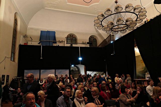 In toller Atmosphäre begab sich Uwe Ittensohn bereits vor Beginn auf die mit schwarzem Stoff abgehängte Bühne, um jede Menge Bücher zu signieren. Währenddessen füllte sich die Kirche zusehends. Ich sah eine Dame mit auffallender Umhängetasche, von der ich bereits etwas gelesen hatte. Der Dombauverein, der dieses Jahr 25 Jahre alt wird, hat ein „Geburtstagshighlight“ für alle an Kunst und Dom Interessierten, nämlich die „Domtaschen“ als Unikate und limitiert auf 100 Stück. Von der Schulmanufaktur trug Bürgermeisterin Monika Kabs das erste Modell der Dommotive spazieren und machte natürlich Werbung dafür. Hergestellt wurden sie von Schülern, Lehrern und Eltern aus von der Kommunalwahl übrig gebliebenen Transparenten mit Dommotiven. Zu kaufen gibt es sie in der Dom-Info neben dem Dom. Der Erlös dieser Taschen geht komplett an den Dombauverein, worüber sich der Vorsitzende Dr. Jung sehr freute. Er hat übrigens das Buch bereits gelesen.
