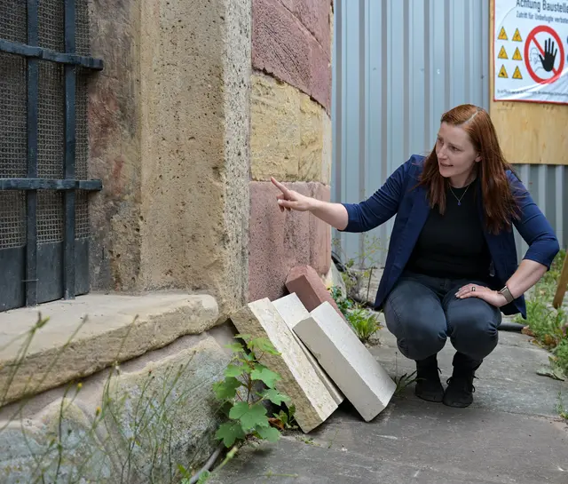 - Dombaumeisterin Hedwig Drabik erläutert, welches Material bei der Sanierung des Südostturms zum Einsatz kommt