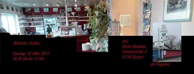 Das nächste Treffen findet am Sonntag, den 10.03.2019, ab 10.30 Uhr bis 12 Uhr, im Bistro Meridian, Heinkelstr. 4 in 67346 Speyer statt. Alle on- und offroadfahrenden Jeeper sind hierzu herzlich eingeladen.