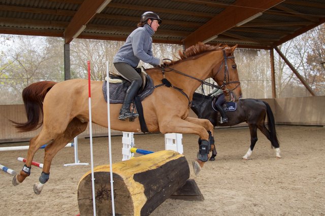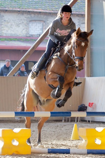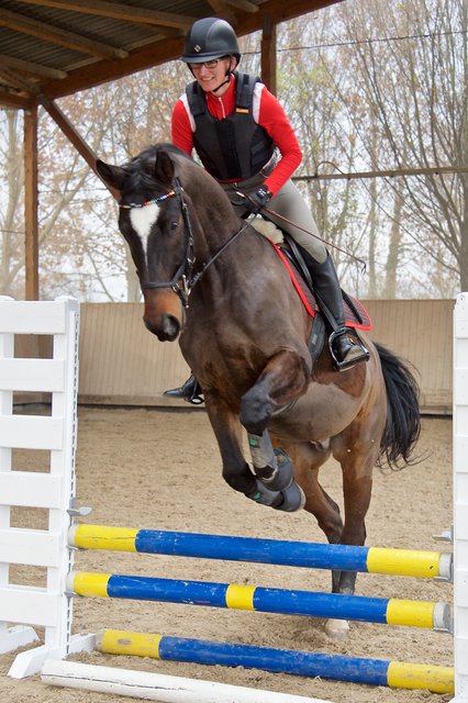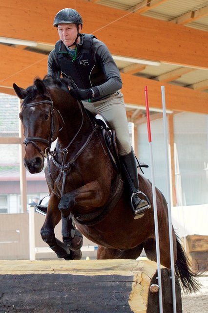 Rittigkeit und Linienführungen, Konzentration zwischen den beweglichen und festen Hindernissen galt es zu verbessern. An beiden Tagen nutzten jeweils 25 Sportamazonen und Reiter die Förderung mit ihren Pferden. „Rechts, links und locker bleiben“ oder „positiv bleiben und Einwirken, das Pferd mitnehmen oder „auf der Linie reiten“ so die Zurufe des Pferdewirtschaftsmeisters Jarno De Busschere; auf alles wurde akribisch geachtet. Geländetypische Hindernisse (von Andreas Hemmer angefertigt und aufgebaut) galt es in der Halle zu überwinden.