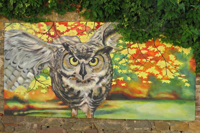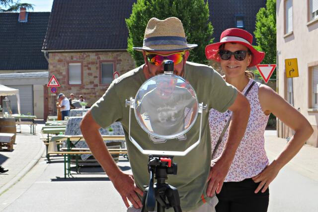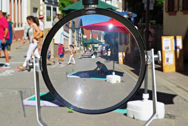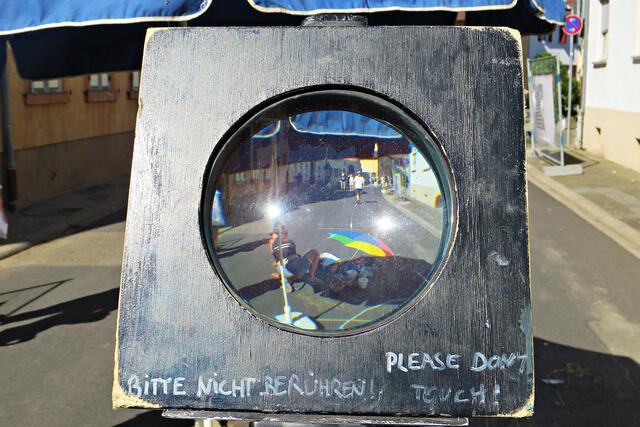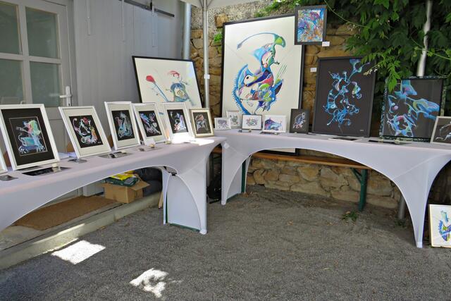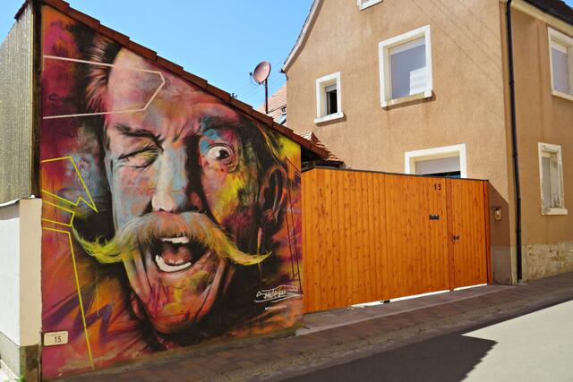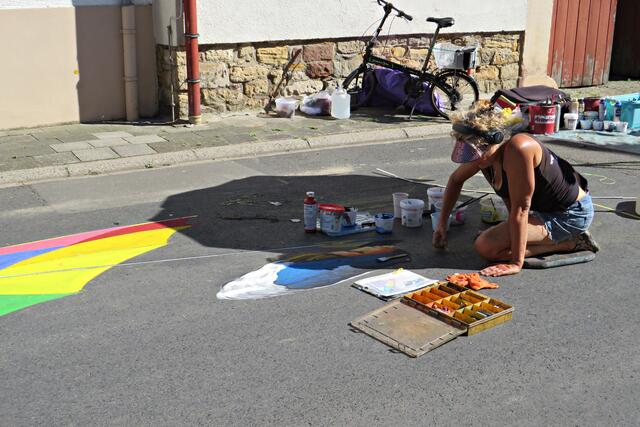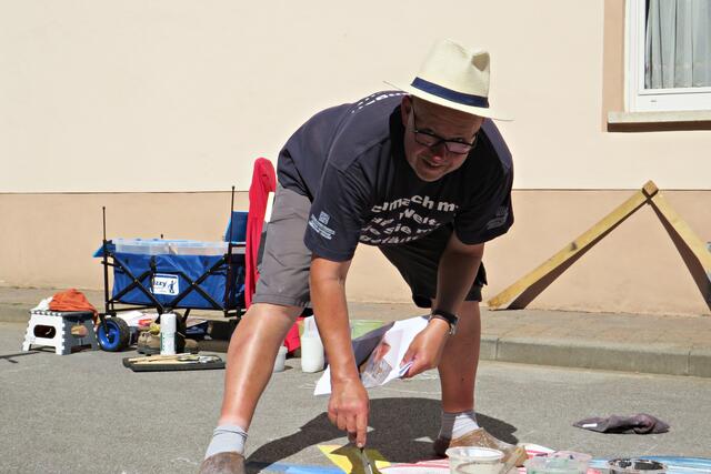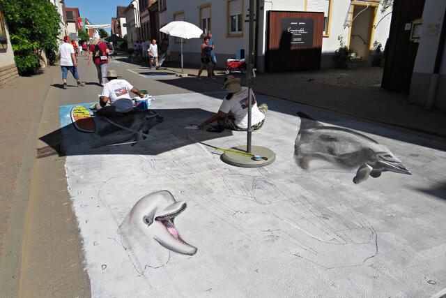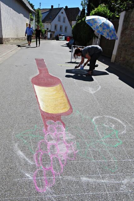 Gönnheim. Anlässlich der Gönnheimer Wein- und Kulturtage vom 1. bis 4. Juli fand auch am Samstag und Sonntag das 6. Internationale Wine-StreetArt-Festival statt. Am 2. Juli besuchte ich das Fest, wobei sich bereits die Parkplatzsuche als schwierig erwies, dabei war es erst 16 Uhr. Wie sollte das erst später am Abend sein, wenn es von den Temperaturen her angenehmer würde und sich mehr Menschen aus ihren schattigen Häusern herauswagten? So saßen denn auch die Künstler meistens unter Sonnenschirmen, in schattigen Ecken oder machten eine ausgiebige Pause. Manche Künstler hatten sich auf die Straßenmalerei fokussiert, andere verewigten sich lieber an Leinwänden und großen Bannern. Die Kunst- und Feiermeile war jeweils an den Straßenenden mit schweren Gefäßen vor einer unbefugten Zufahrt blockiert. Eintritt wurde keiner verlangt.