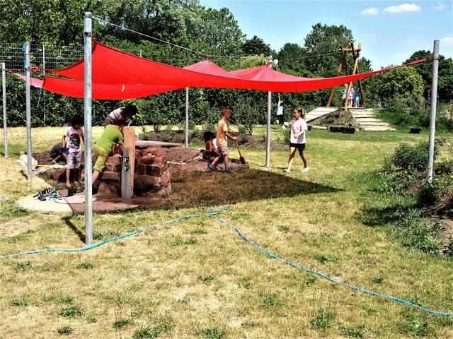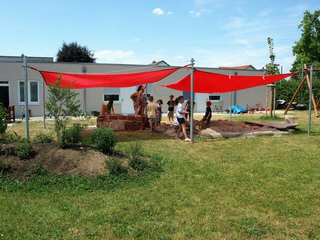 Unschwer ist zu erkennen, mit welcher Freude die neuen Aufenthaltsmöglichkeiten in Anspruch genommen werden. Begehrt ist vor allem der Sandspielplatz mit dem Wasserlauf und dem roten Sonnendach. Das Ambiente sagt zu, es gefällt. Zu finden sind vier Spielgeräte, auch attraktive Klettergeräte, fünf Pflanzeninseln und vier Bäume, die alsbald viel Schatten spenden sollen.