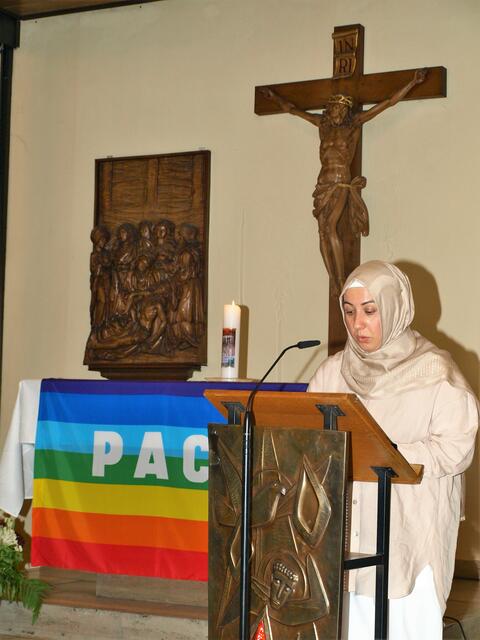 Zu hören ist (vor dem Altar mit dem Kruzifix, der Schrift „Pace“ und den Regenbogenfarben) nicht nur das „Vater unser“, sondern auch in arabischer Sprache die „Sura 1 al-Fatiha“: Im Namen Allahs, des Allerbarmers…leite uns den rechten Weg.“ Immer wieder kommt in den verschiedenen Gebeten und Fürbitten zum Ausdruck, dass Gott die Gläubigen dazu aufruft, in Liebe und Achtung miteinander umzugehen.