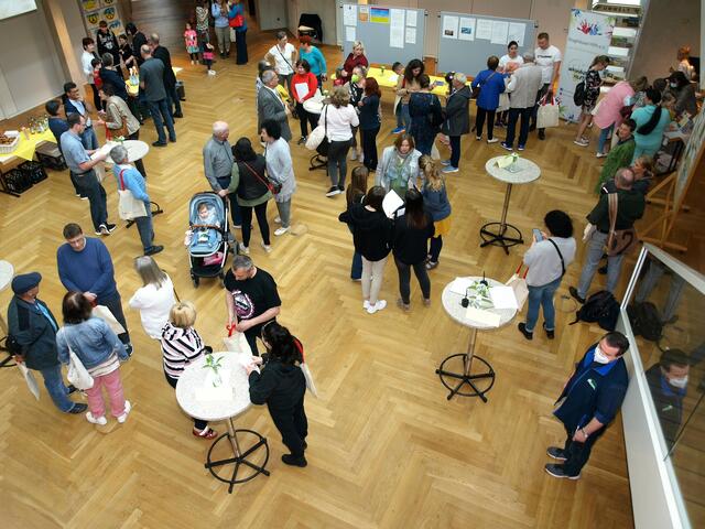 Die seit Kriegsbeginn eingetroffenen Menschen aus dem osteuropäischen Land und ihre ehrenamtlichen Unterstützer, Betreuer und Gastgeber lud die Stadtverwaltung zu einem Treffen mit Informationen über die Stadt und mit allem Wissenswerten, zu einem Kennenlernen und einem Austausch ins Atrium des Rathauses ein.